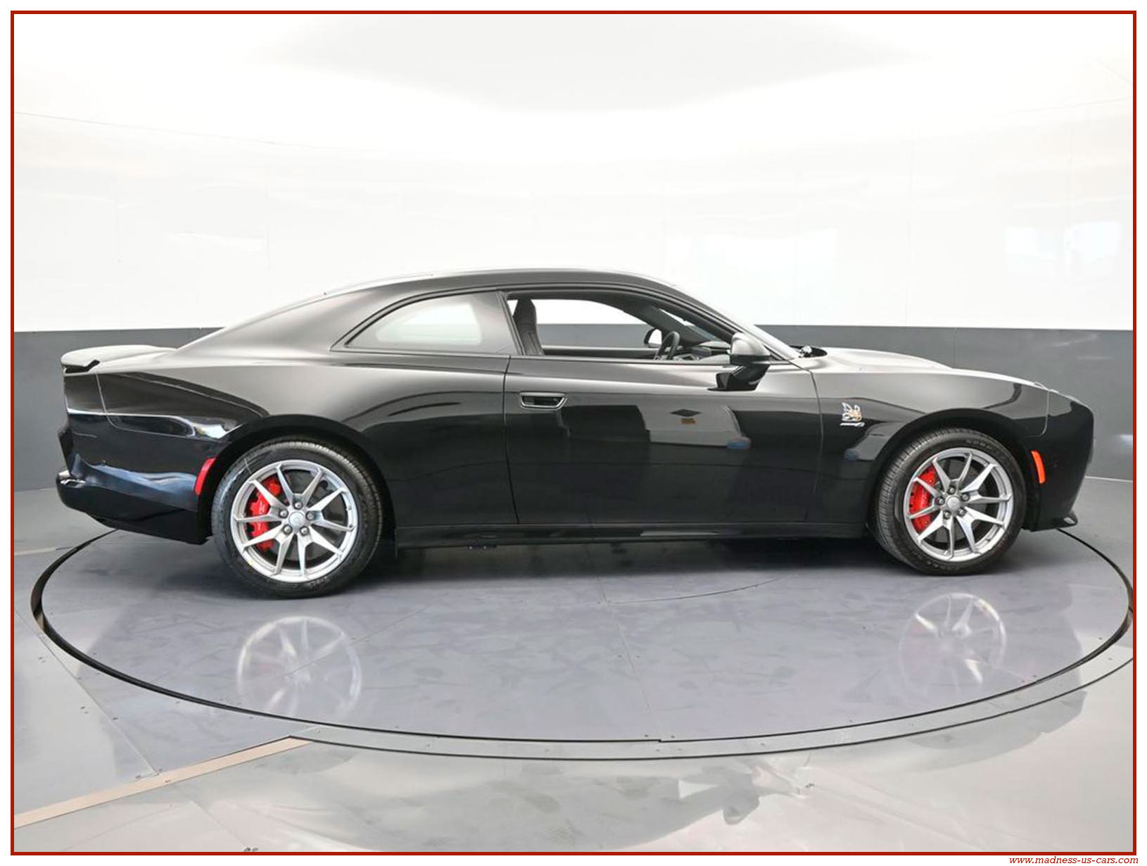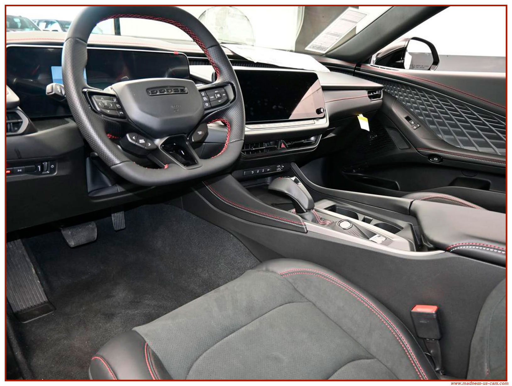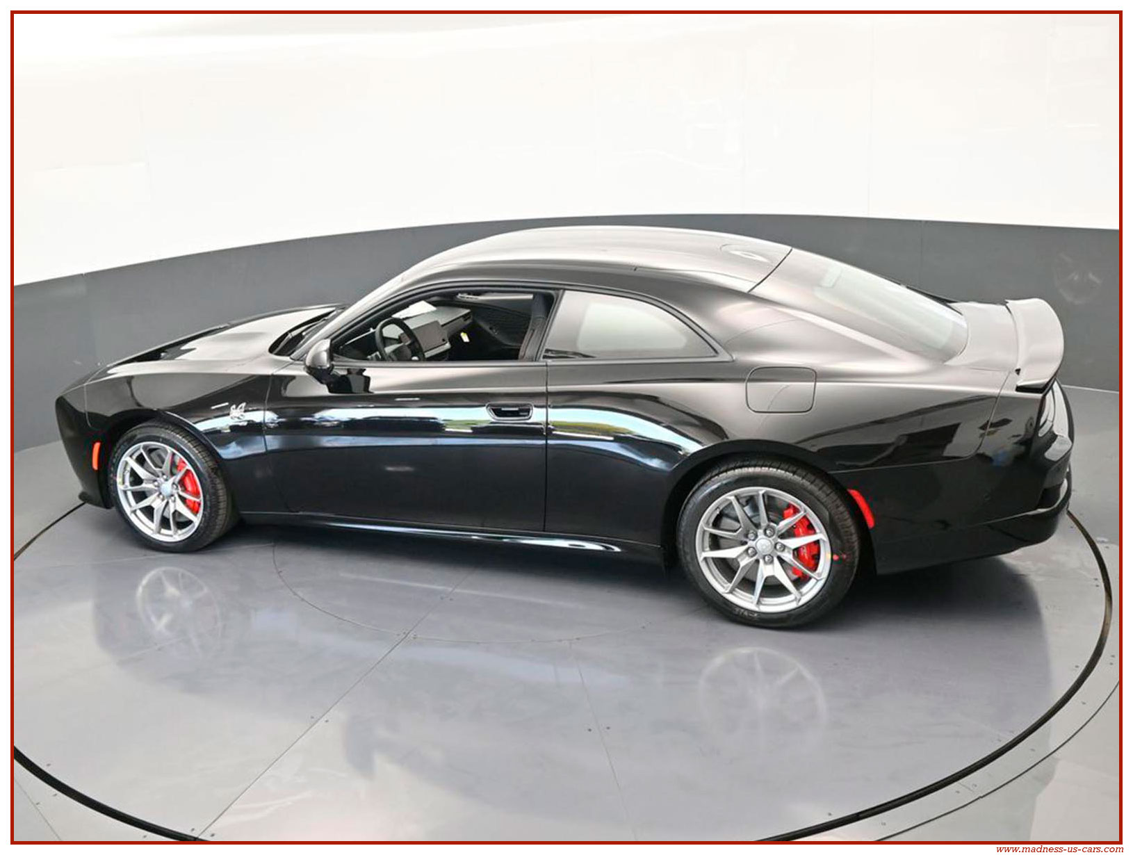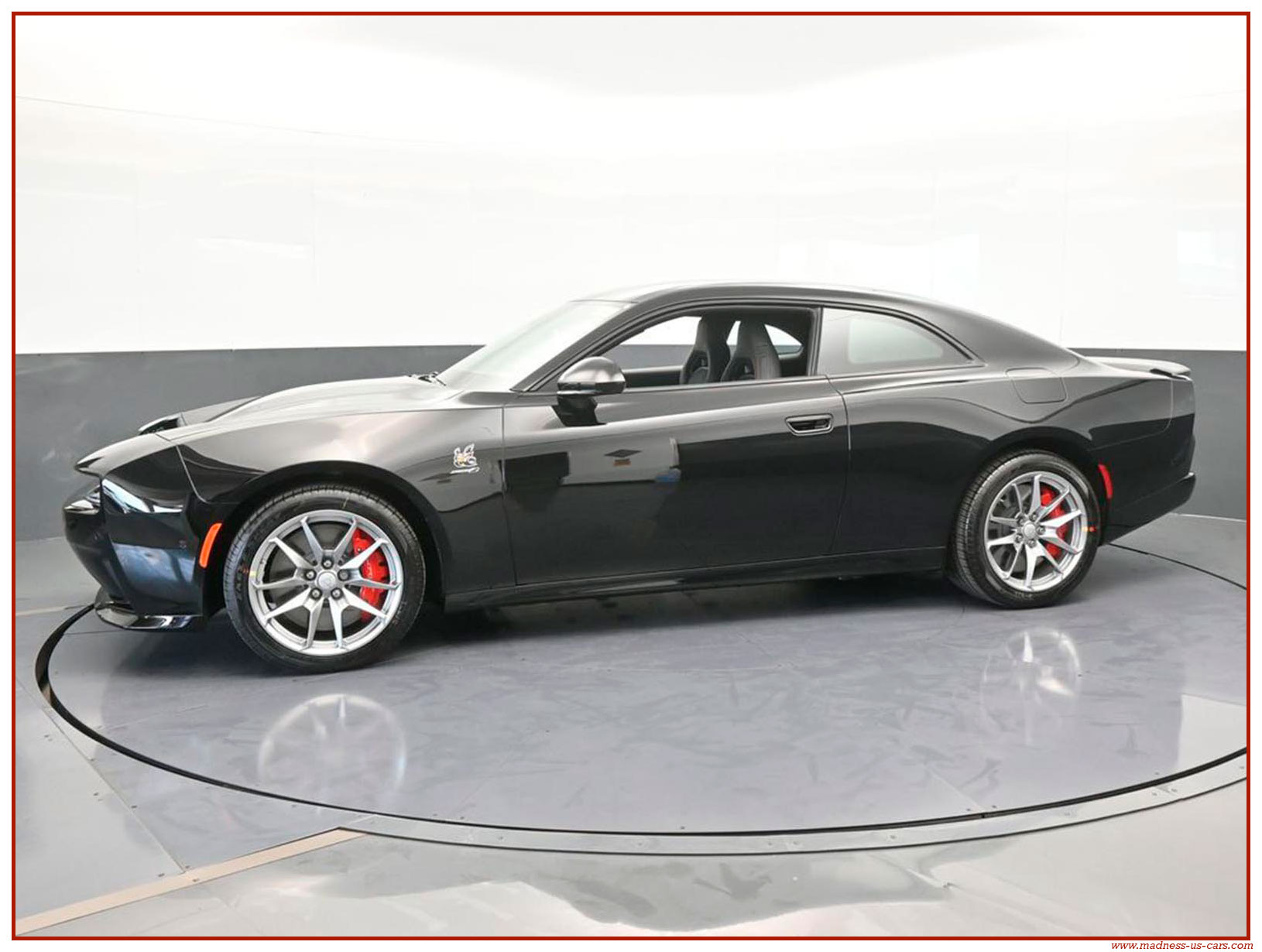 Cette nouvelle Dodge Charger électrique est une version Daytona Stage 2 avec la plus importante motorisation possible. Elle est proposée par Madness US avec un excellent niveau d'équipement : Auditorium Alpine 914 watts avec 10 enceintes, écran central 12,3 pouces avec navigation GPS, écran conducteur 16 pouces, caméra de recul, feux à leds, sellerie en cuir alcantara avec sièges chauffants et climatisés, jantes aluminium 20 pouces, freinage Brembo gros diamètre, toit vitré panoramique ... Rappelons aussi que la Charger EV propose un système de bruiteur, ce système s'appelle Fratzonic Chambered Exhaust.