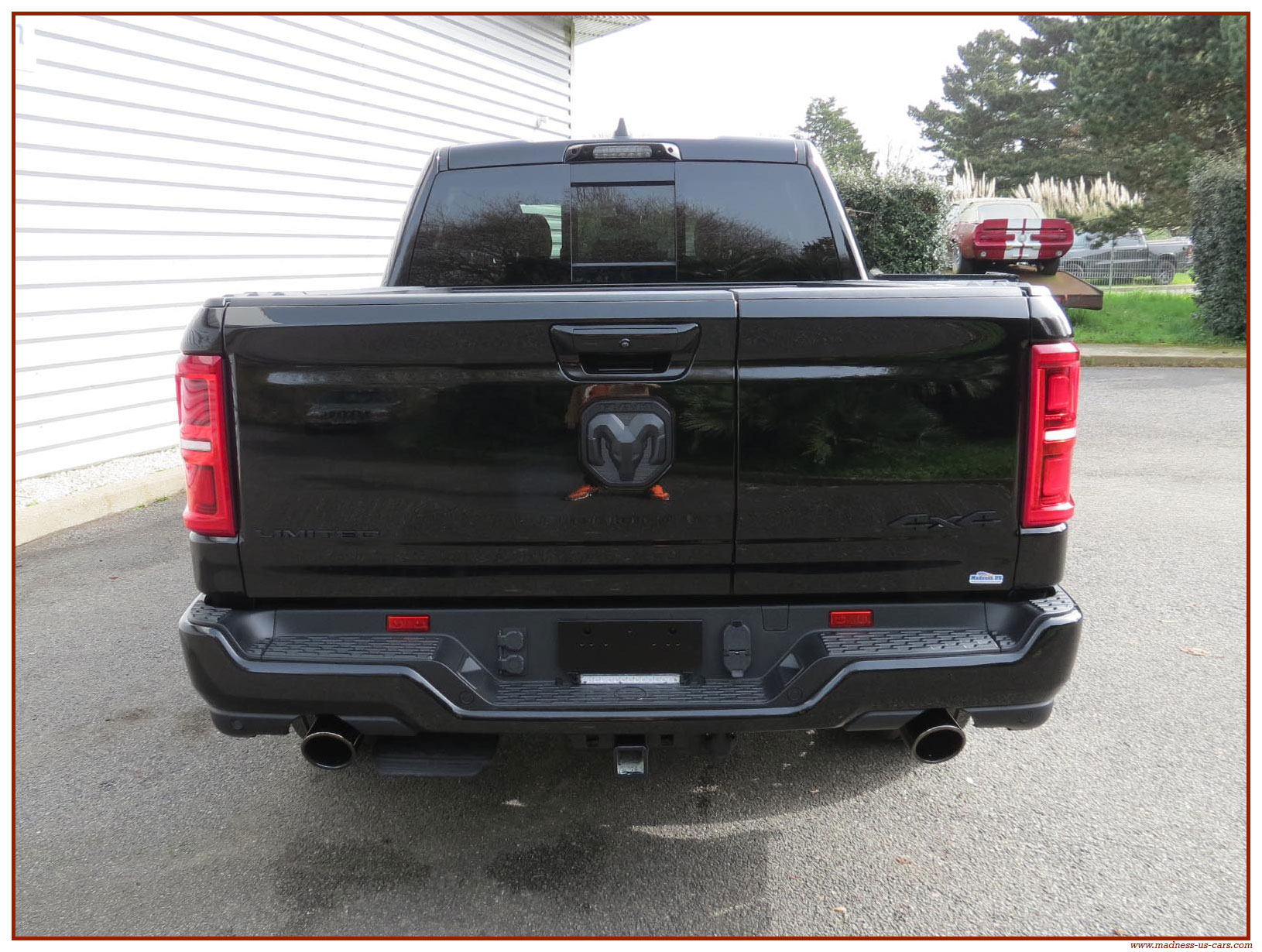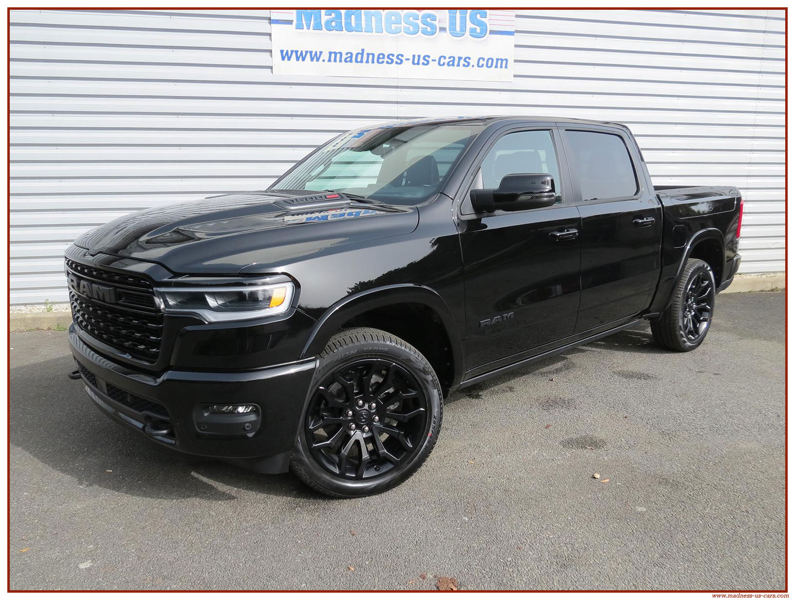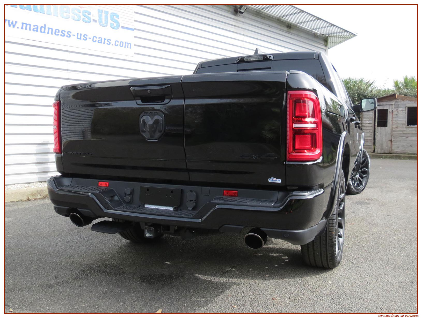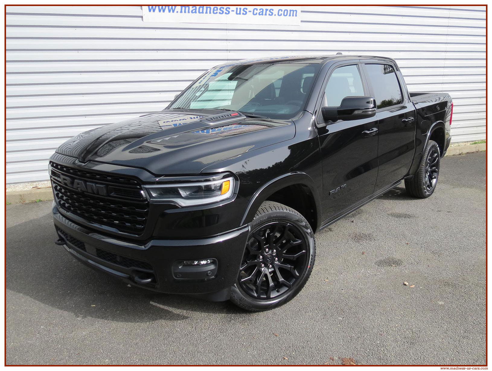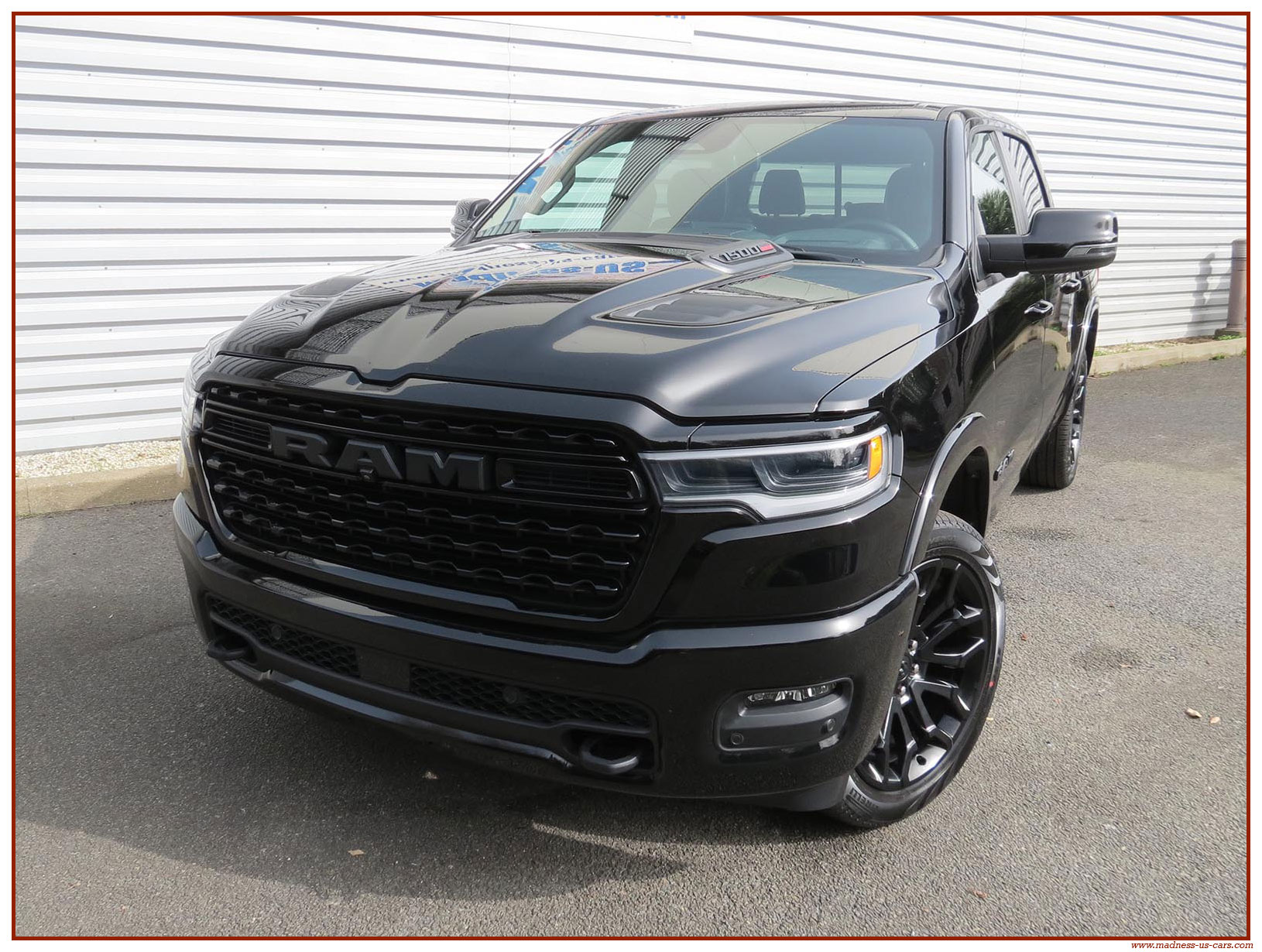 Madness US vous propose en France le nouveau Ram 1500 modèle 2025 dans la finition haut de gamme Limited avec le pack Night Edition. Ce package remplace les éléments chromés tels les jantes ou les pare chocs par des pièces de couleur noire. Ce Ram Limited 2025 Night Edition est équipé des coffres de bennes RamBox, des suspensions pneumatiques et du hayon multifonction. Le Ram 1500 Limited 2025 est équipé du nouveau moteur 6 cylindres en ligne Hurricane SST HO, ce moteur L6 Biturbo propose la puissance de 540 chevaux pour un couple de 705 Nm. Ce Ram 1500 de dernière génération, se singularise par sa montée en gamme, en effet il dispose d'équipements d'assistance à la conduite les plus modernes : Stationnement automatisé, aide au maintien dans la voie, régulateur de vitesse adaptatif avec freinage d'urgence, capteurs d'angle mort, caméra 360° ...