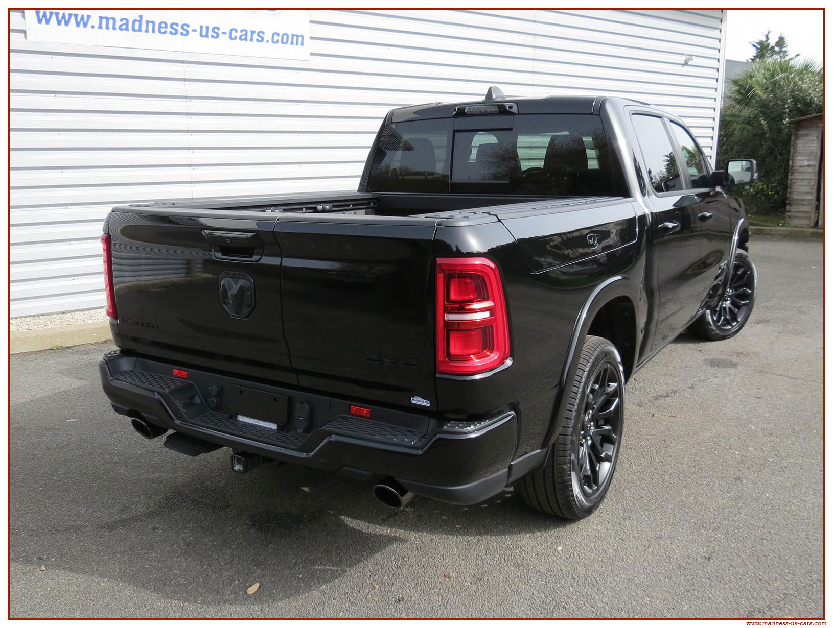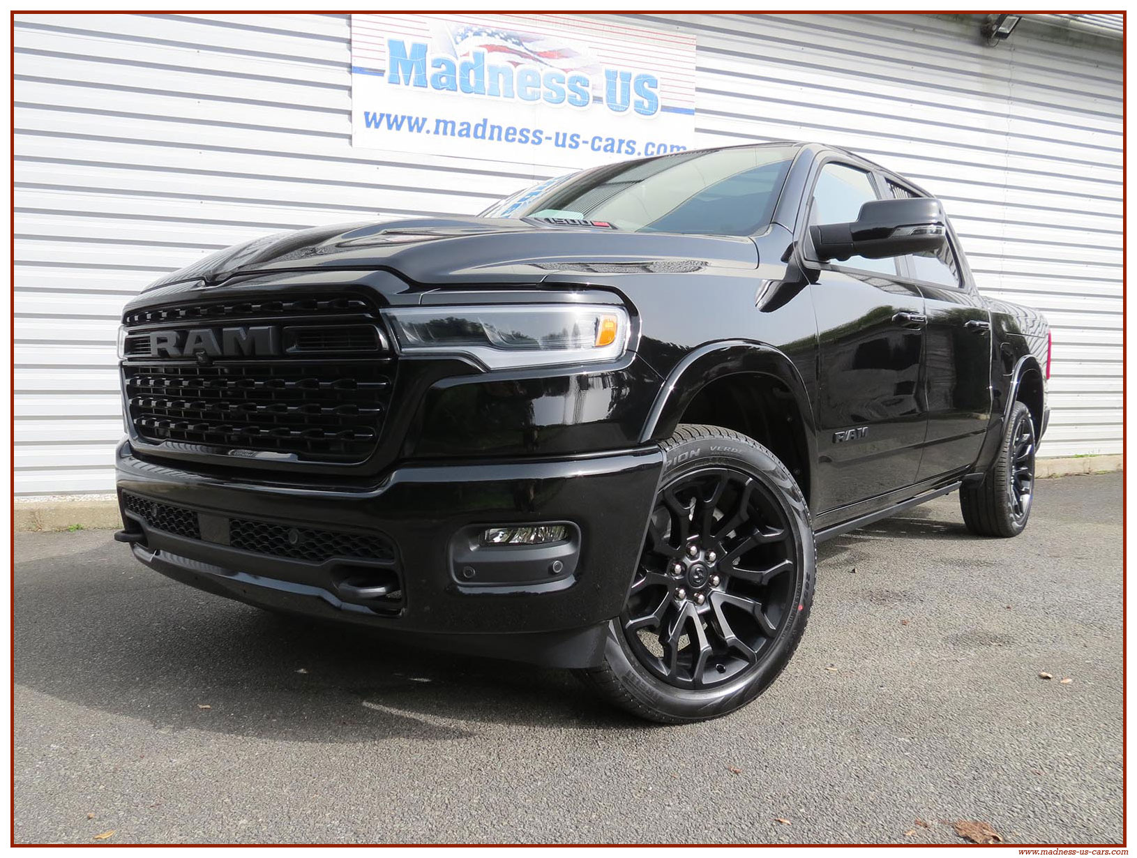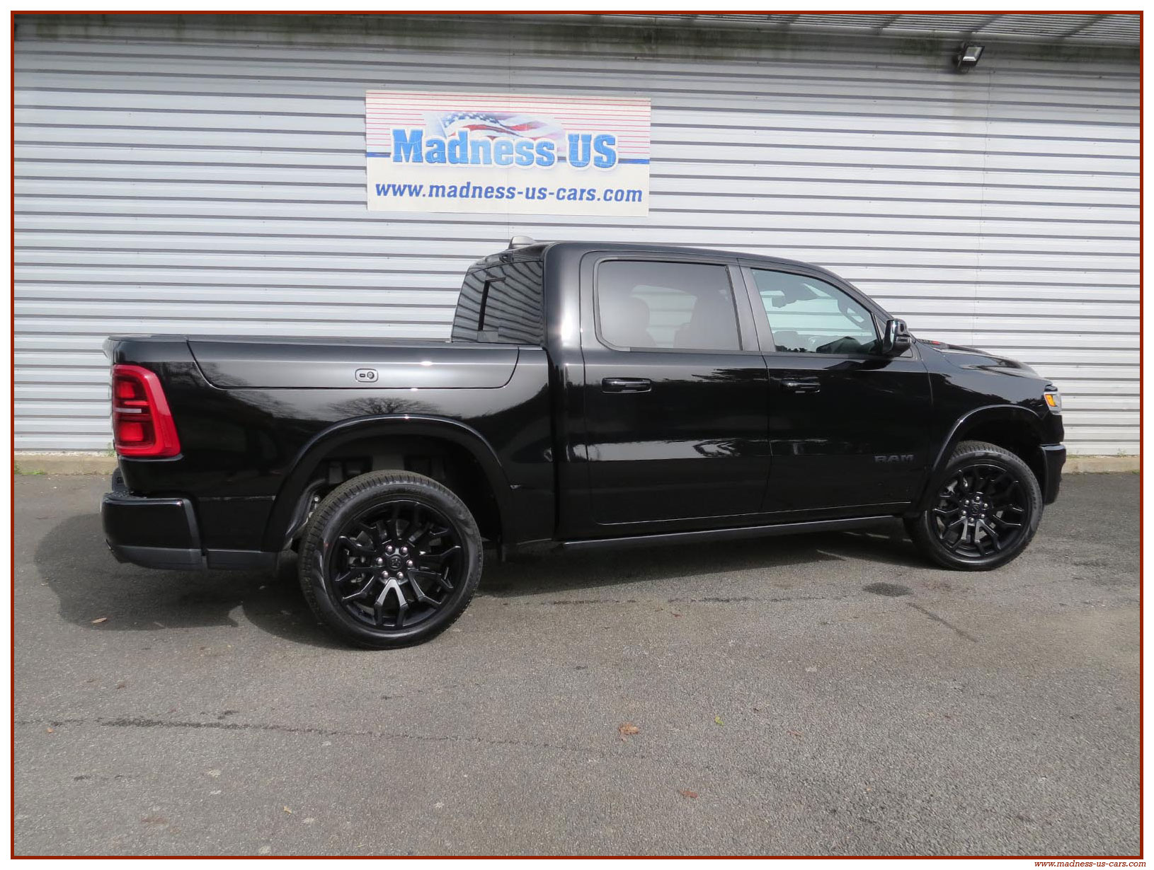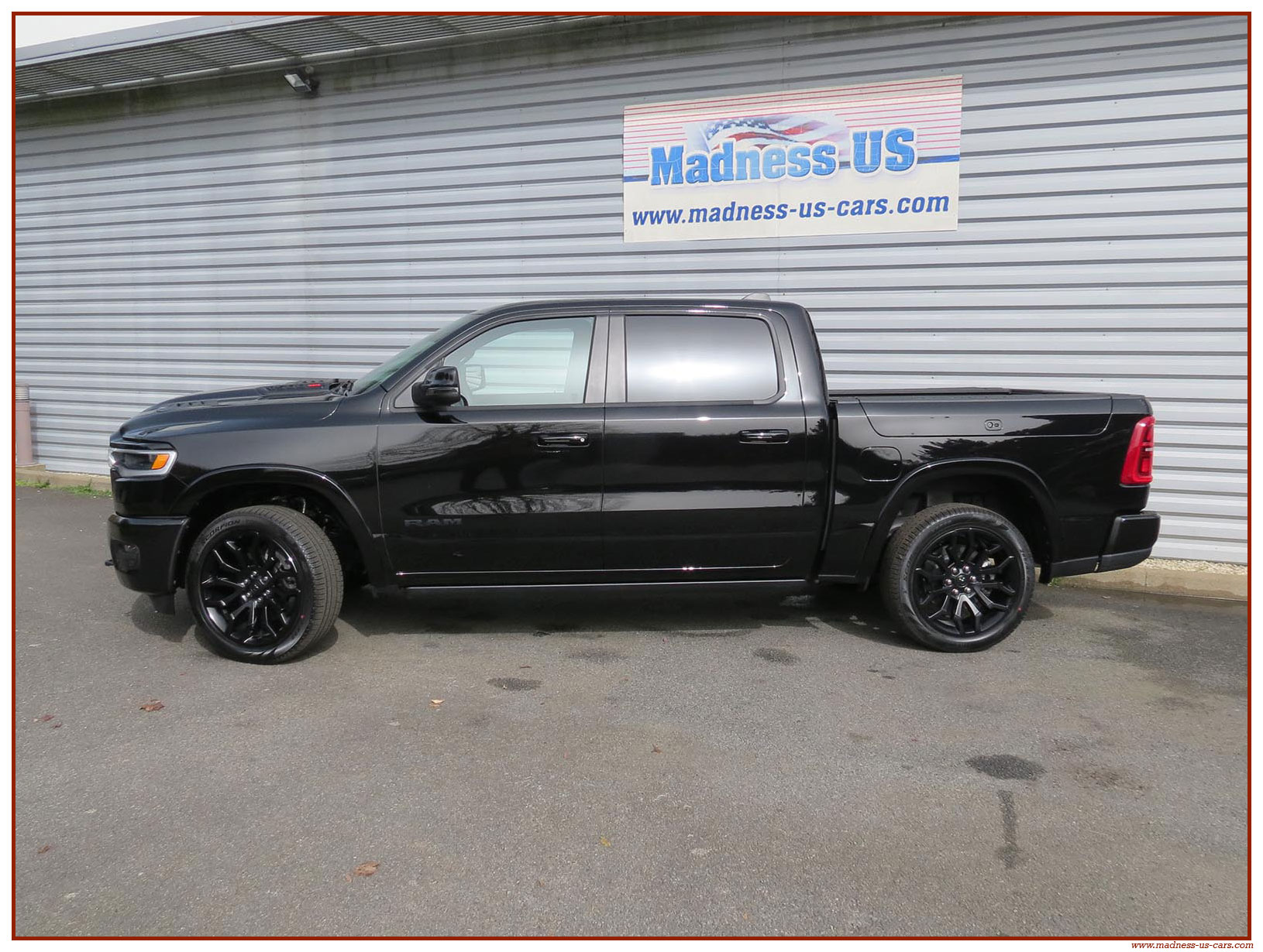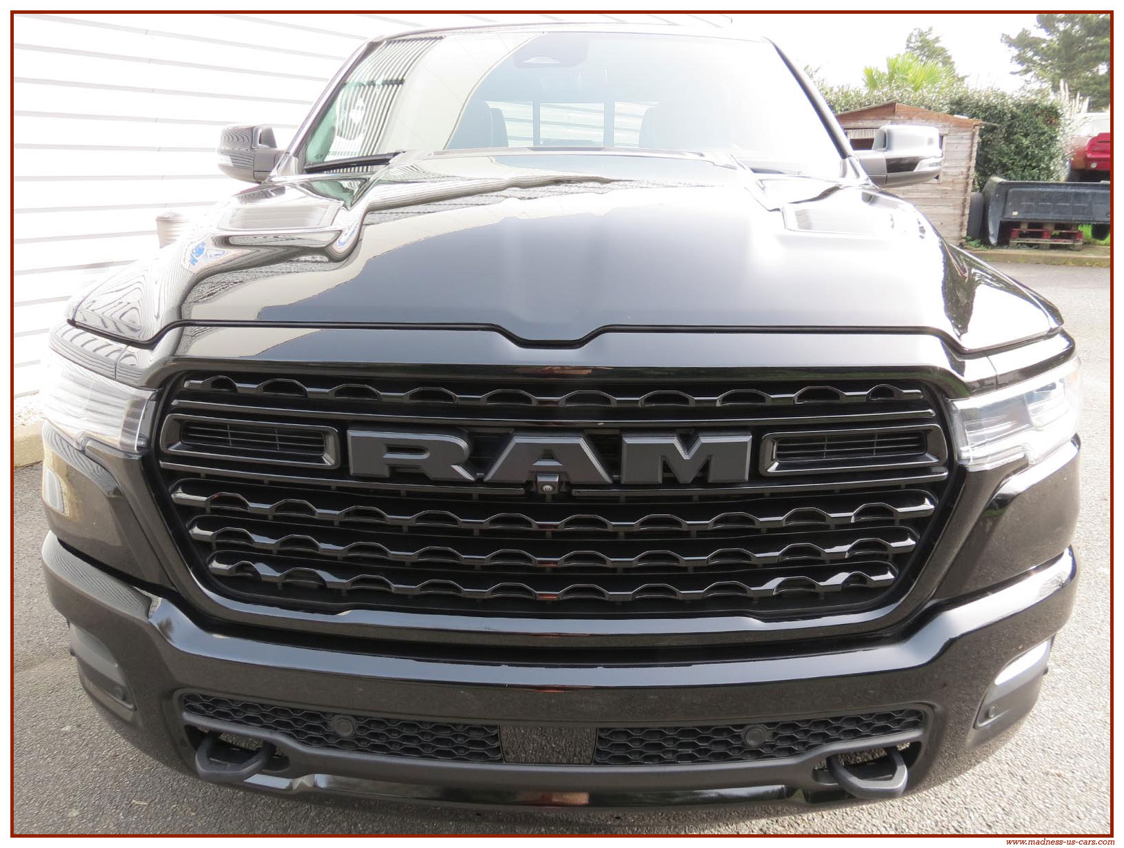 Madness US vous propose en France le nouveau Ram 1500 modèle 2025 dans la finition haut de gamme Limited avec le pack Night Edition. Ce package remplace les éléments chromés tels les jantes ou les pare chocs par des pièces de couleur noire. Ce Ram Limited 2025 Night Edition est équipé des coffres de bennes RamBox, des suspensions pneumatiques et du hayon multifonction. Le Ram 1500 Limited 2025 est équipé du nouveau moteur 6 cylindres en ligne Hurricane SST HO, ce moteur L6 Biturbo propose la puissance de 540 chevaux pour un couple de 705 Nm. Ce Ram 1500 de dernière génération, se singularise par sa montée en gamme, en effet il dispose d'équipements d'assistance à la conduite les plus modernes : Stationnement automatisé, aide au maintien dans la voie, régulateur de vitesse adaptatif avec freinage d'urgence, capteurs d'angle mort, caméra 360° ...