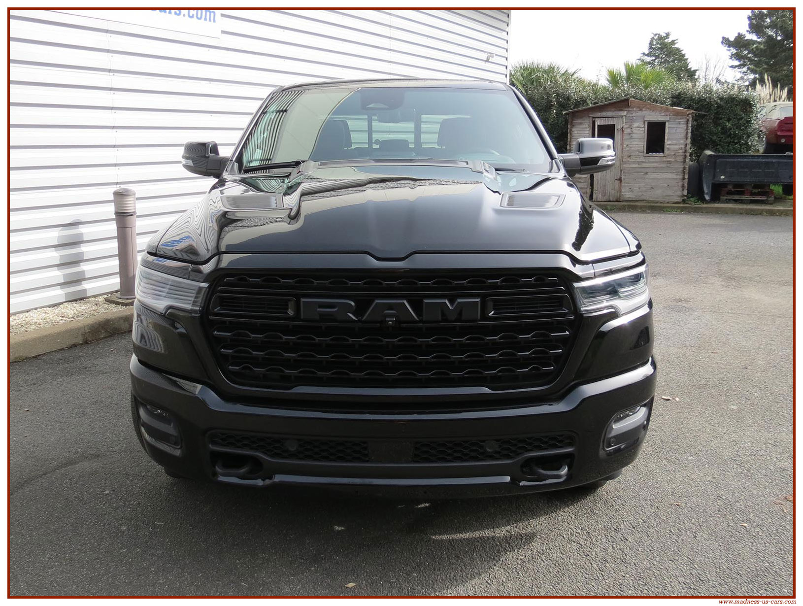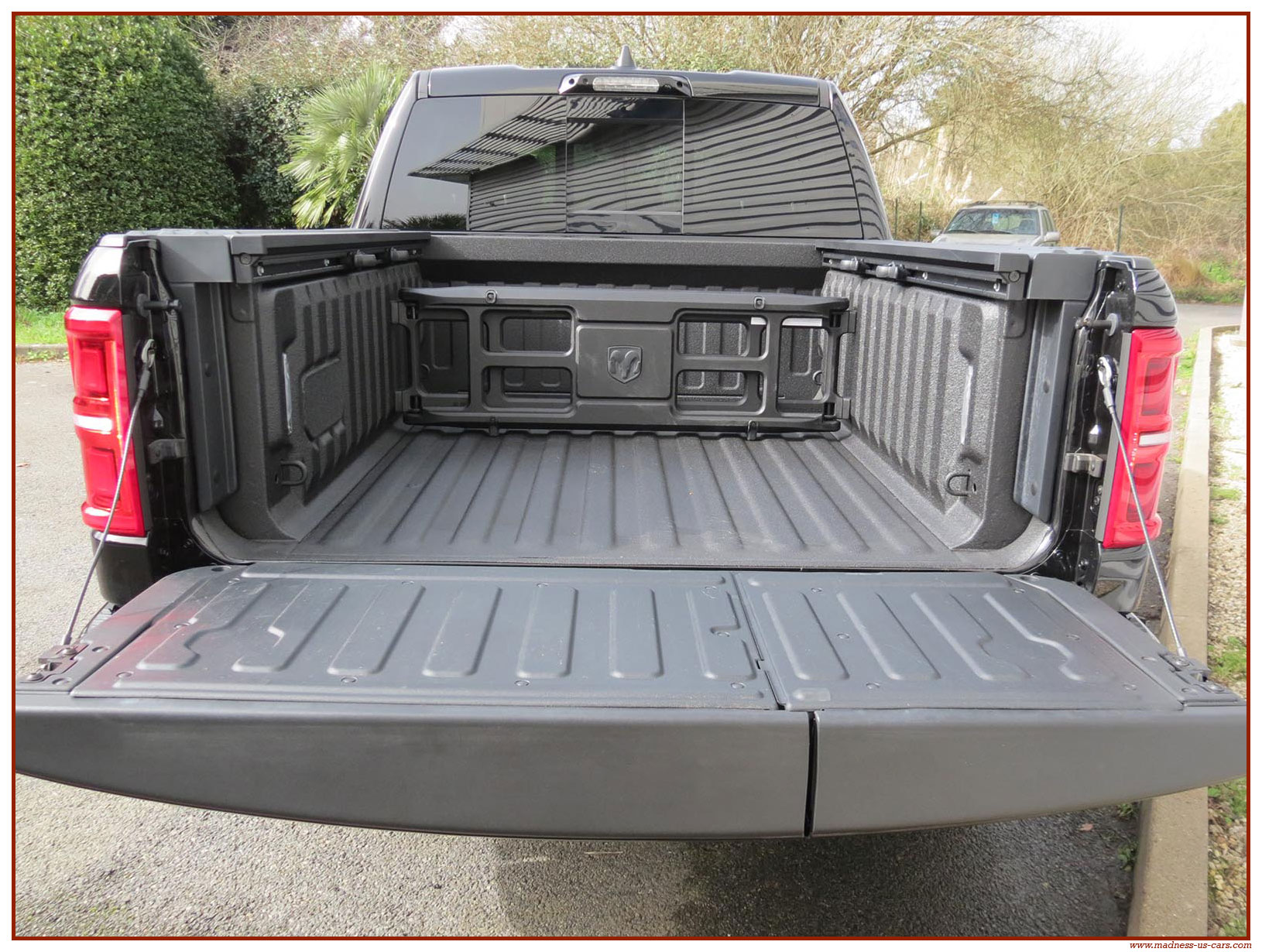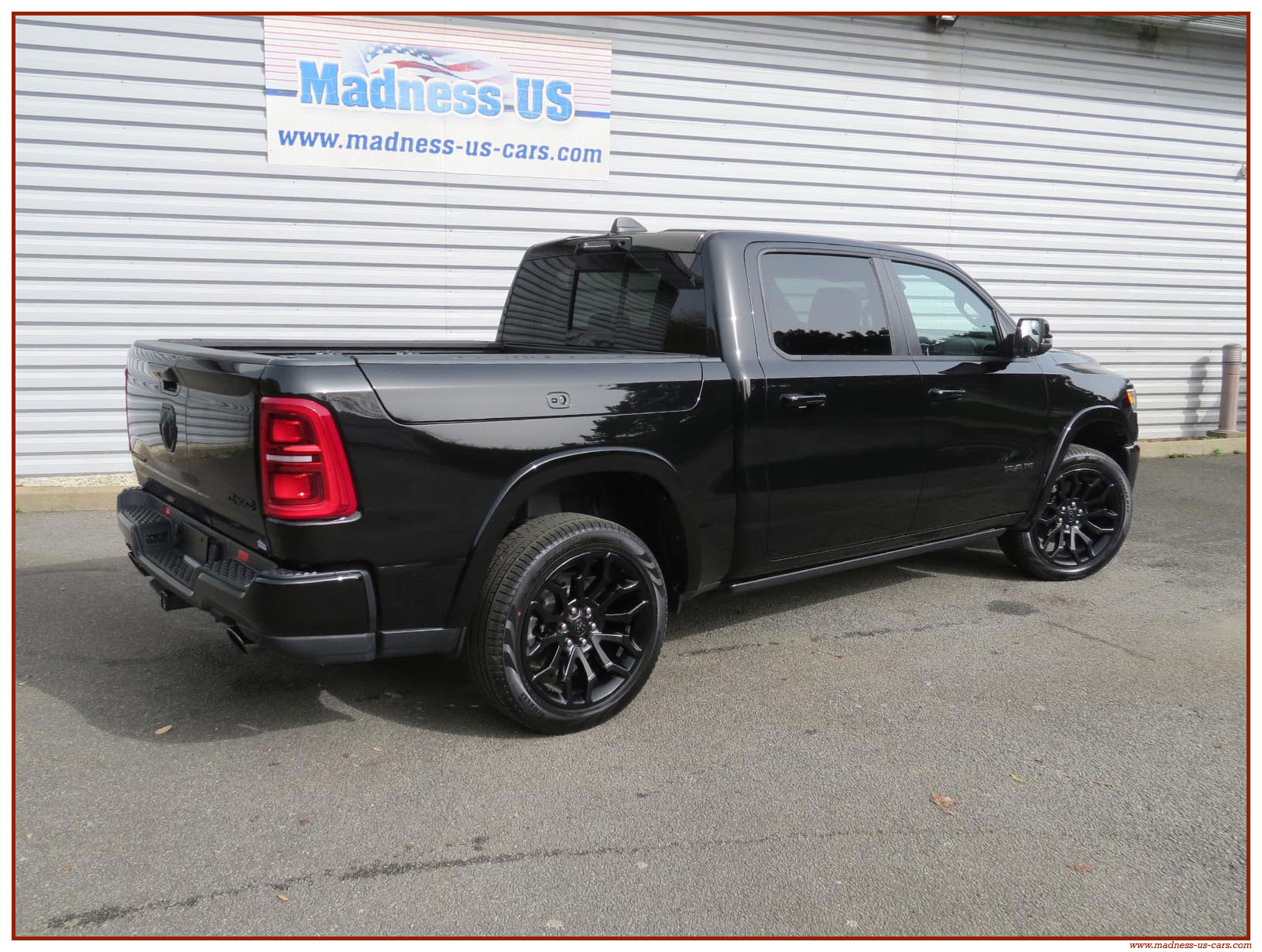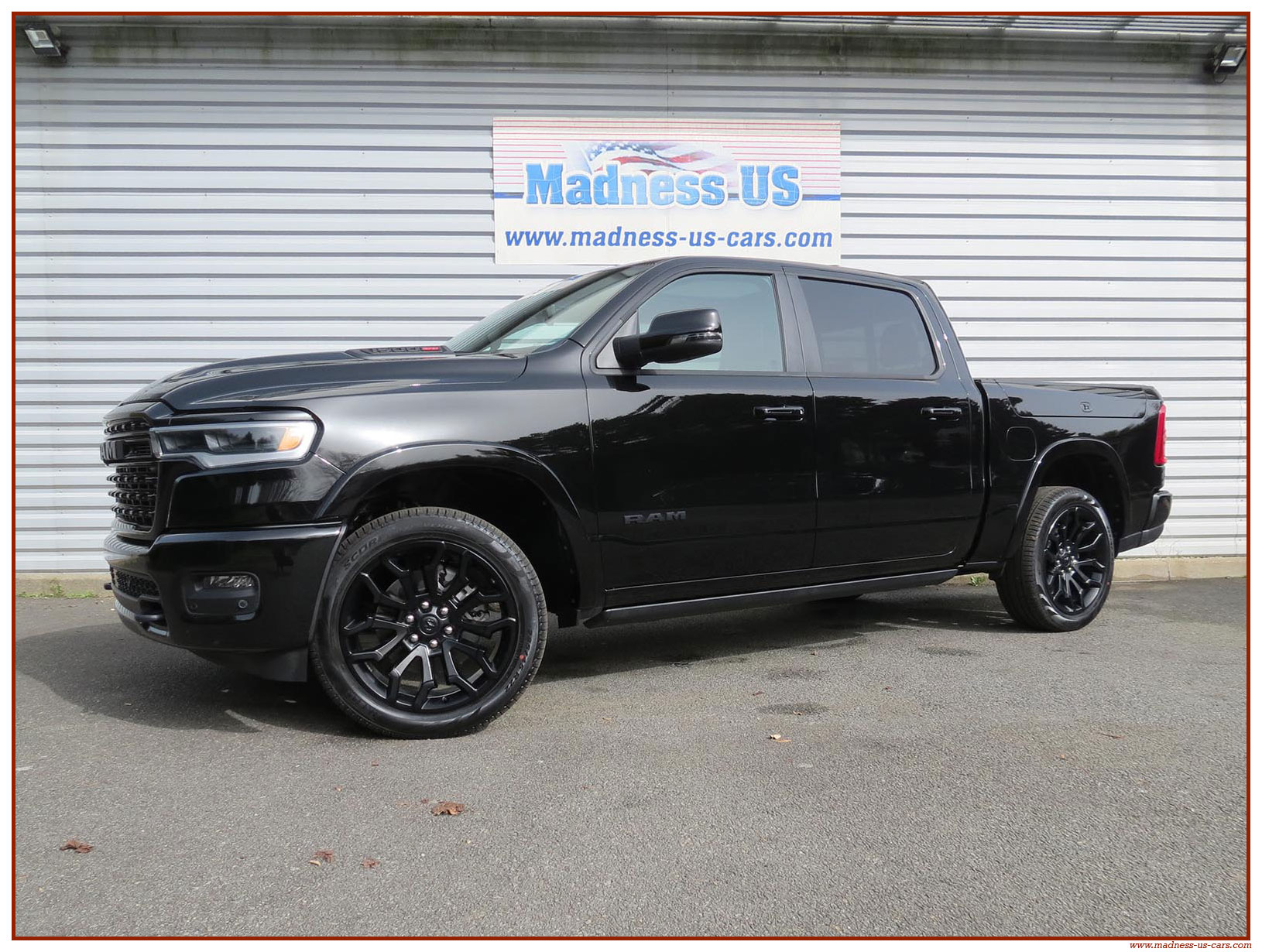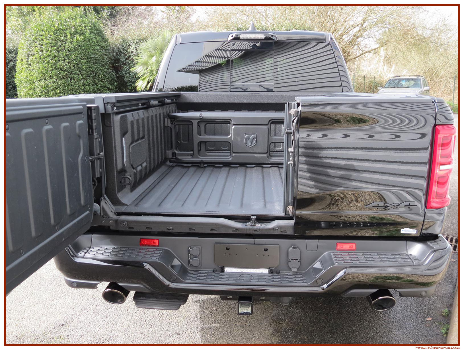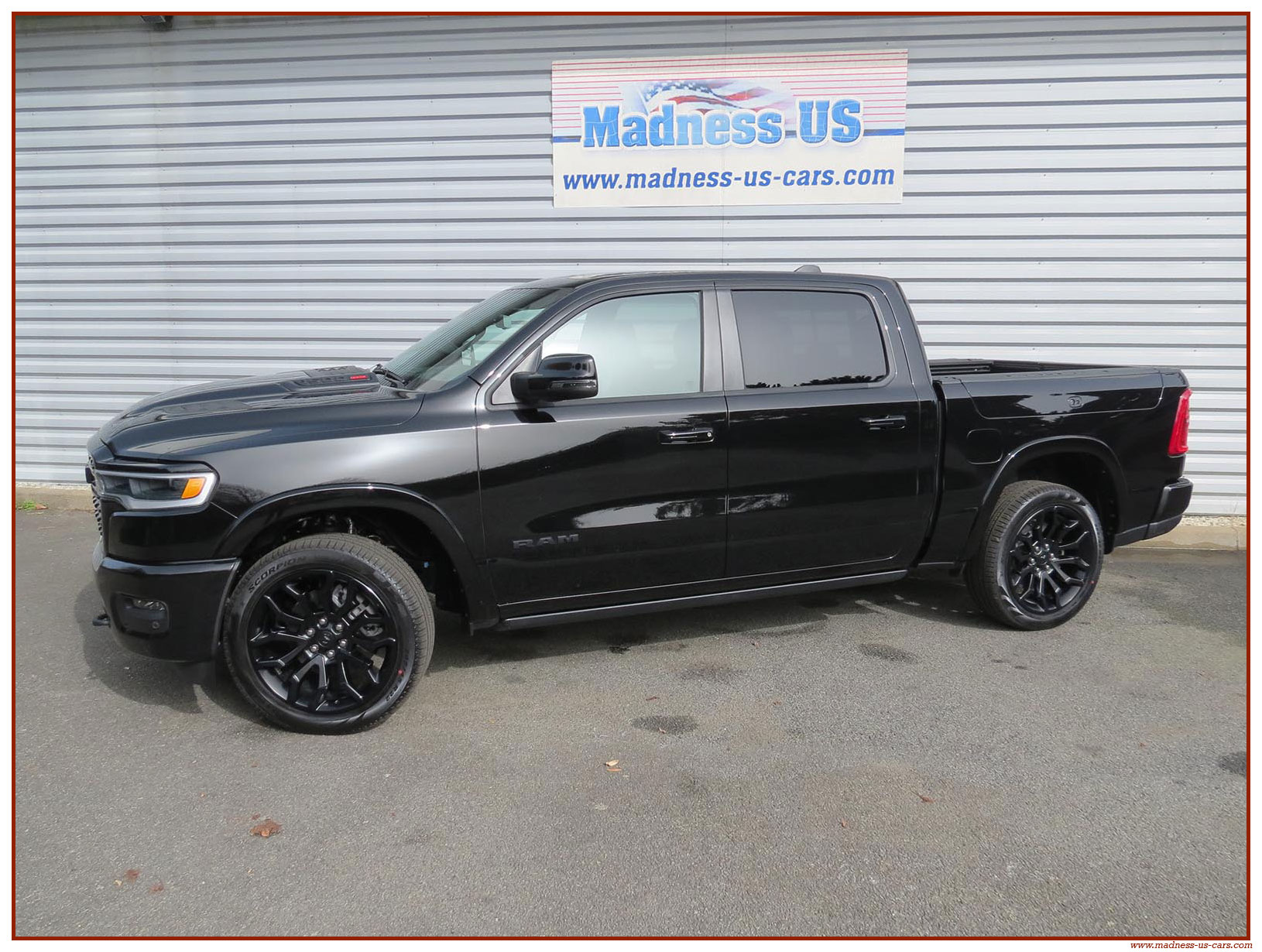Madness US vous propose en France le nouveau Ram 1500 modèle 2025 dans la finition haut de gamme Limited avec le pack Night Edition. Ce package remplace les éléments chromés tels les jantes ou les pare chocs par des pièces de couleur noire. Ce Ram Limited 2025 Night Edition est équipé des coffres de bennes RamBox, des suspensions pneumatiques et du hayon multifonction. Le Ram 1500 Limited 2025 est équipé du nouveau moteur 6 cylindres en ligne Hurricane SST HO, ce moteur L6 Biturbo propose la puissance de 540 chevaux pour un couple de 705 Nm. Ce Ram 1500 de dernière génération, se singularise par sa montée en gamme, en effet il dispose d'équipements d'assistance à la conduite les plus modernes : Stationnement automatisé, aide au maintien dans la voie, régulateur de vitesse adaptatif avec freinage d'urgence, capteurs d'angle mort, caméra 360° ...