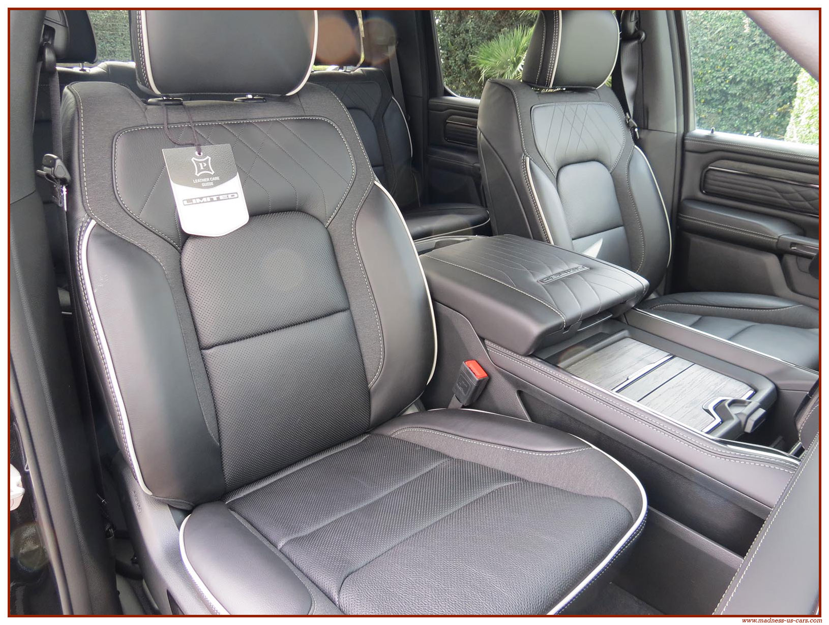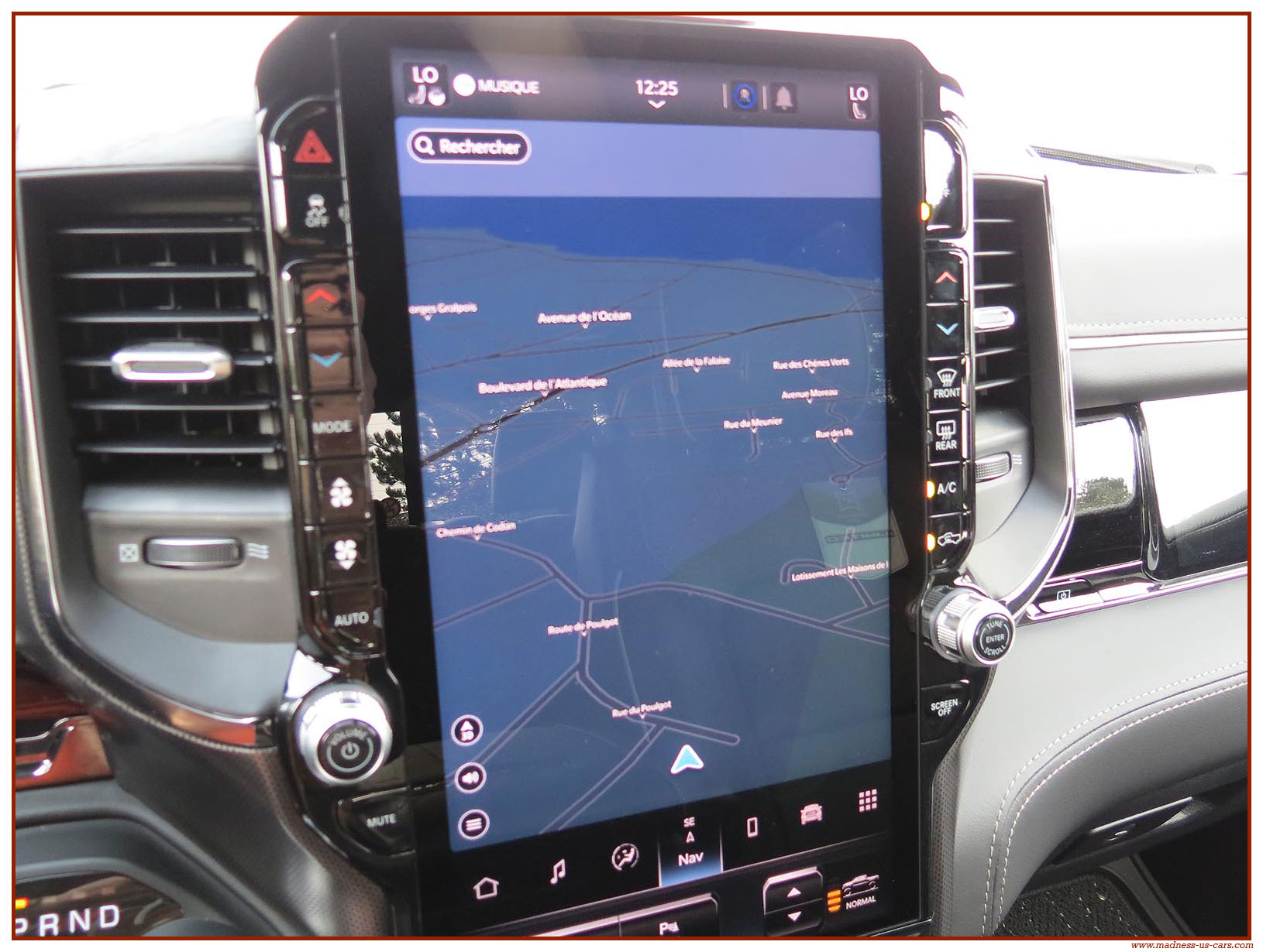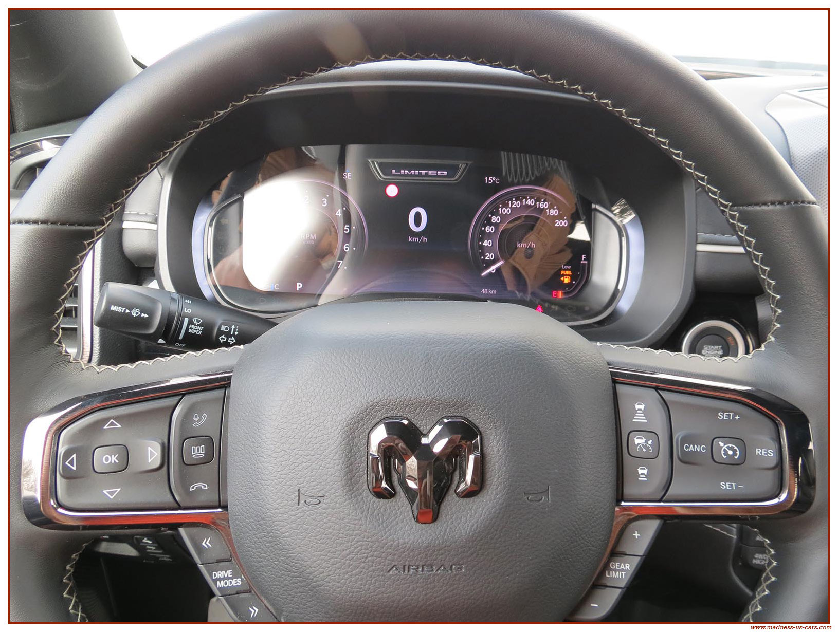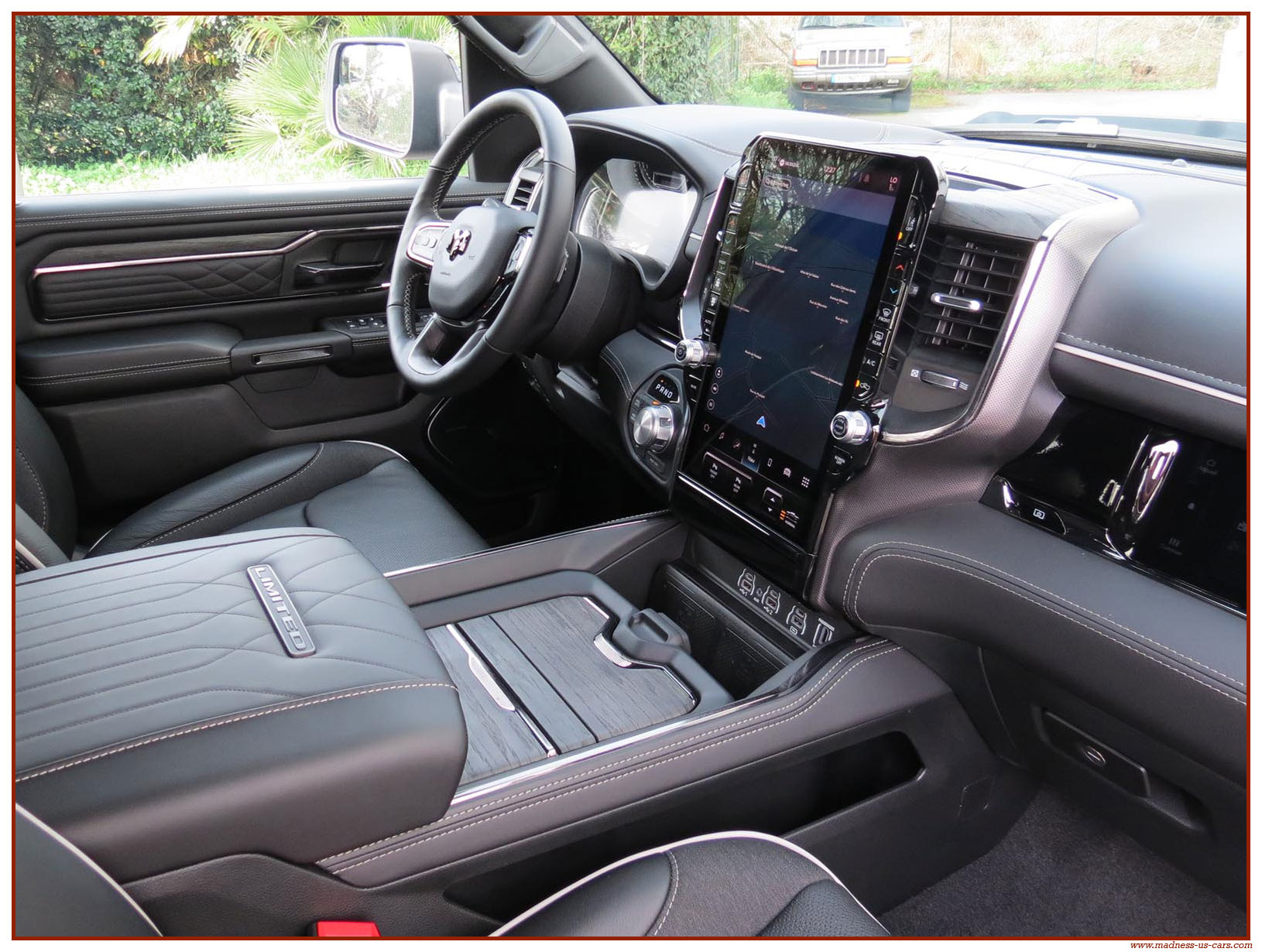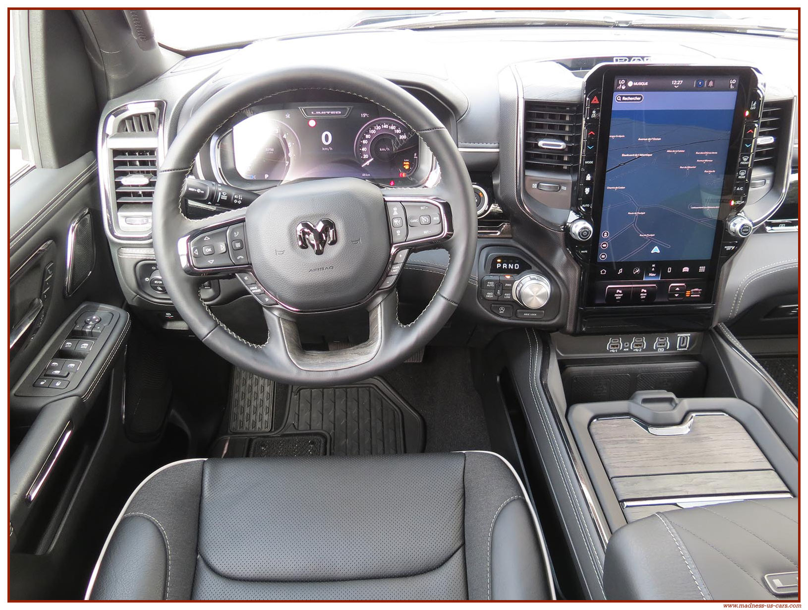 Le Ram 1500 Limited 2025 propose un équipement complet et haut de gamme : Système audio Harman Kardon avec 19 enceintes, écran de divertissement 10,2 pouces pour le passager avant, écran central tactile 14,5 pouces avec navigation GPS, Mirror Screen, Bluetooth, caméra 360°, radars de stationnement avant et arrière, sièges électriques en cuir chauffants, climatisés et massants, toit ouvrant panoramique, démarrage à distance, suspensions pneumatiques ... Ce Dodge Ram 1500 Limited modèle 2025 est proposé par Madness US, neuf, homologué en France et garanti 24 mois.