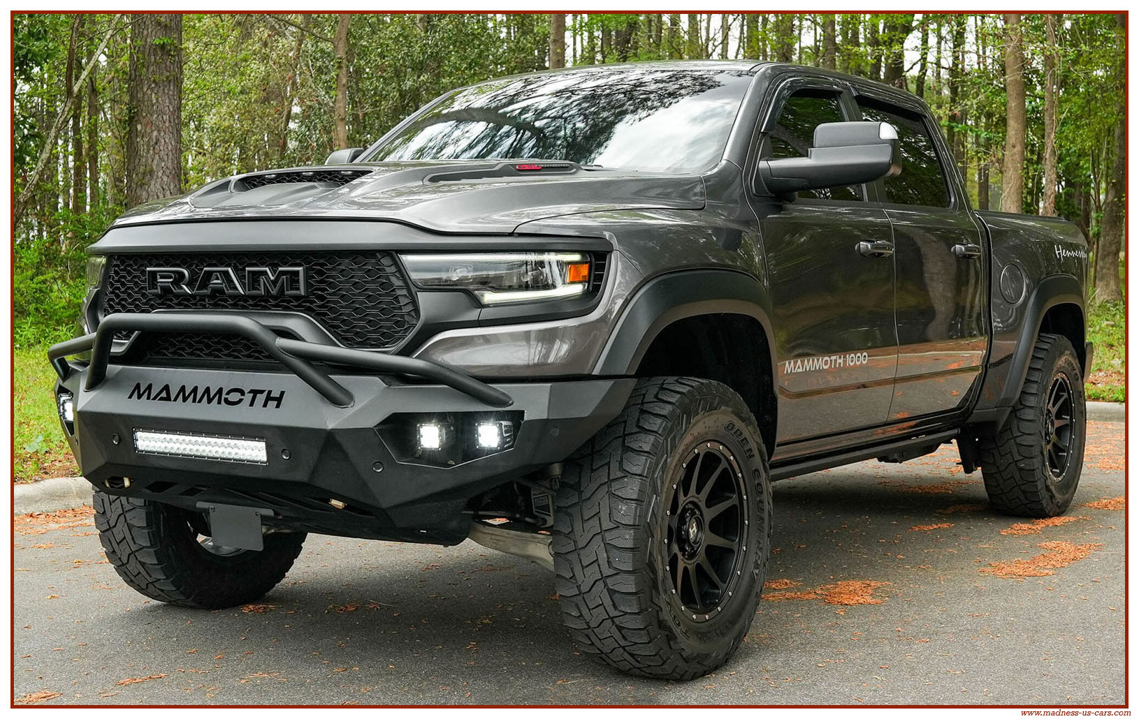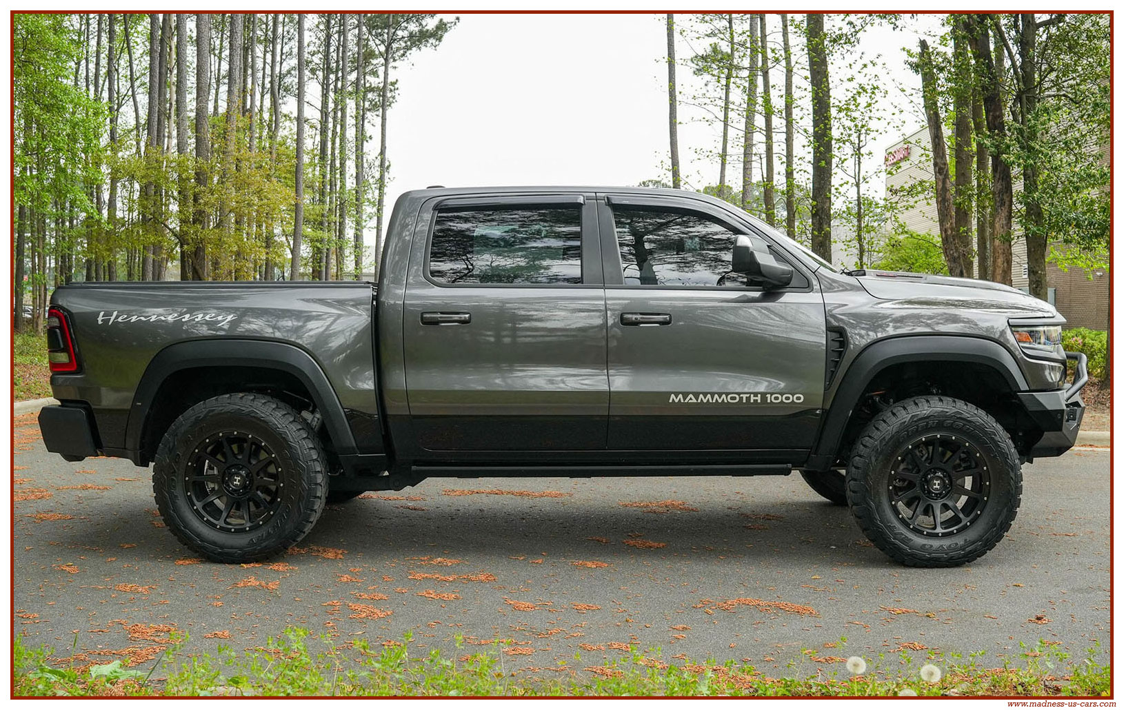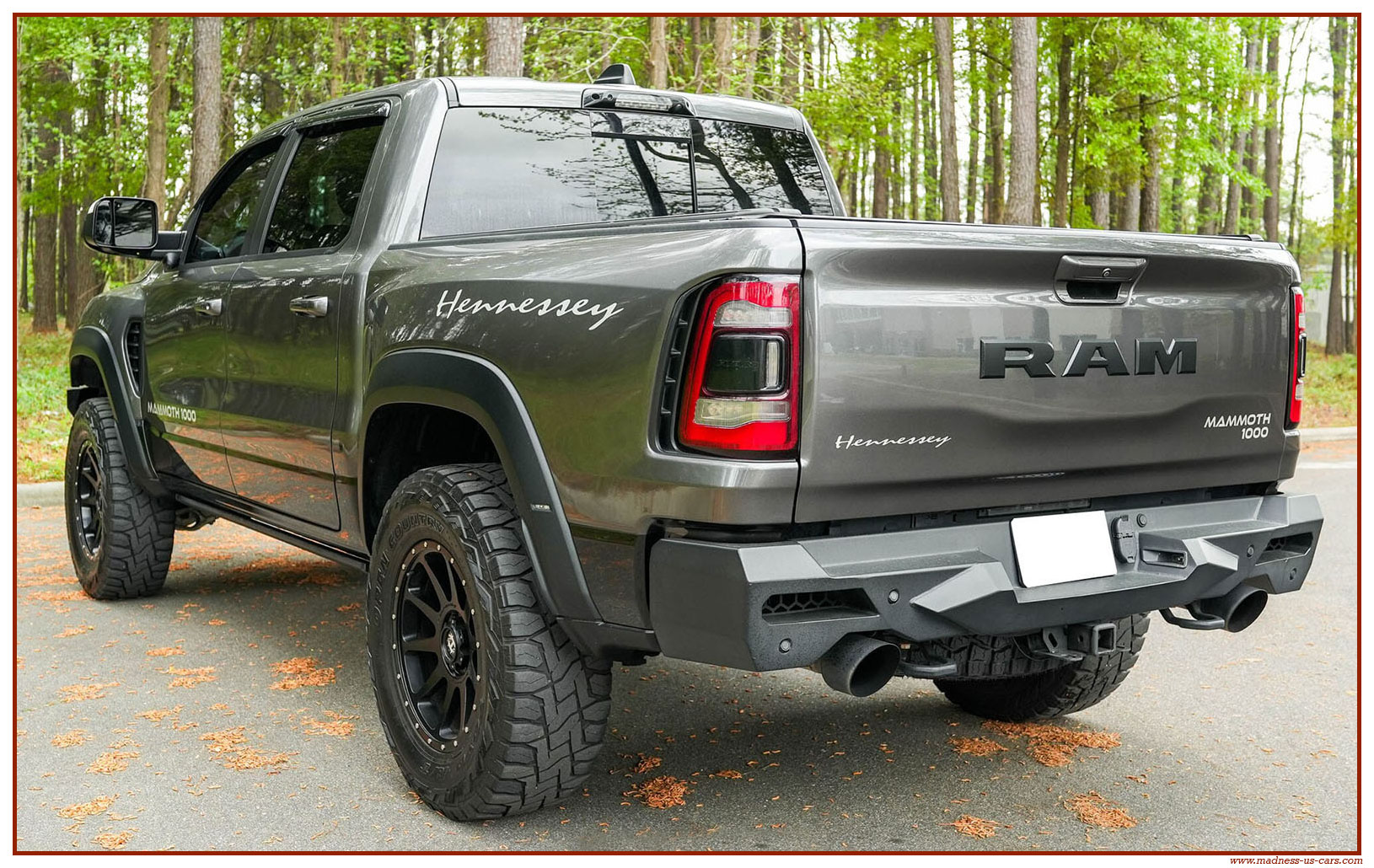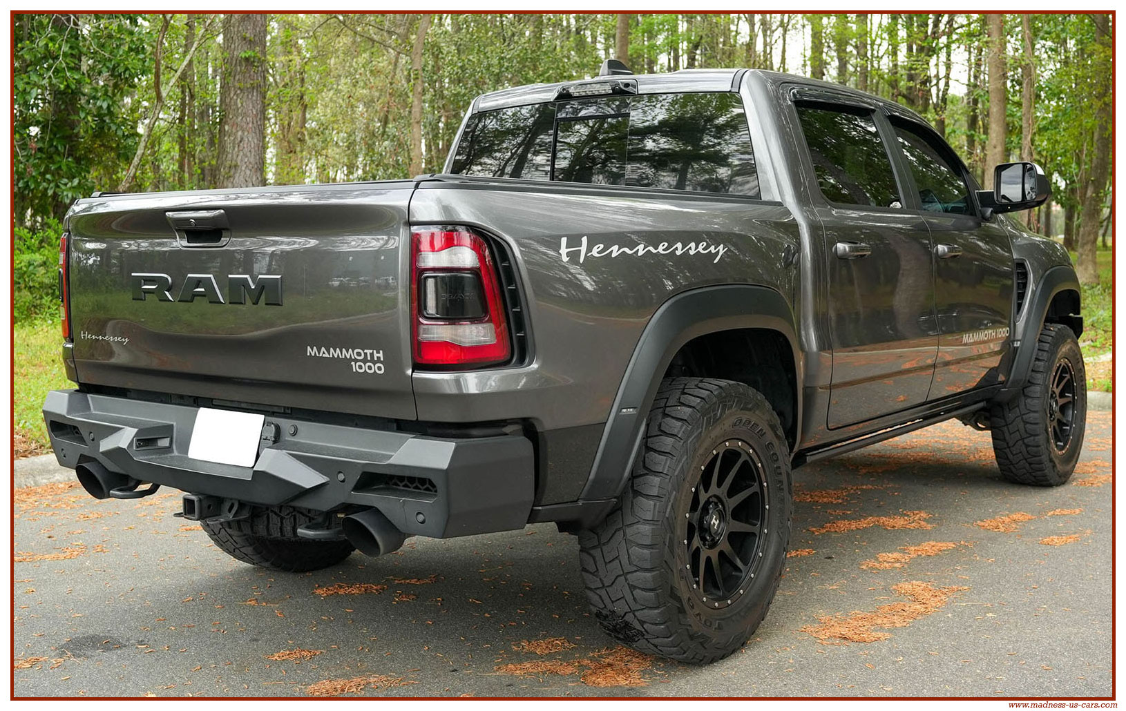 Madness US vous propose la version la plus exclusive du Ram 1500 TRX. Le Hennessey Mammoth 1000 est la version ultime du Ram TRX passée entre les mains du célèbre préparateur Texan, 200 exemplaires seulement produits ! Hennessey à complètement revu le V8 Supercharged de 6,2 litres de cylindrée : Il développe maintenant la puissance de 1012 chevaux pour un couple de 1312 Nm. C'est le pickup le plus puissant du marché, et aussi le plus performant : Le 0 à 100 km/h est abattu en 3,2 secondes seulement.
