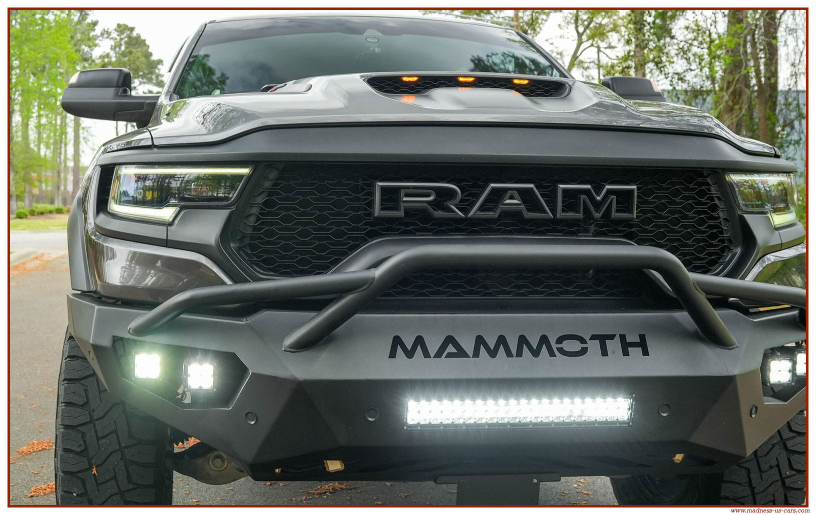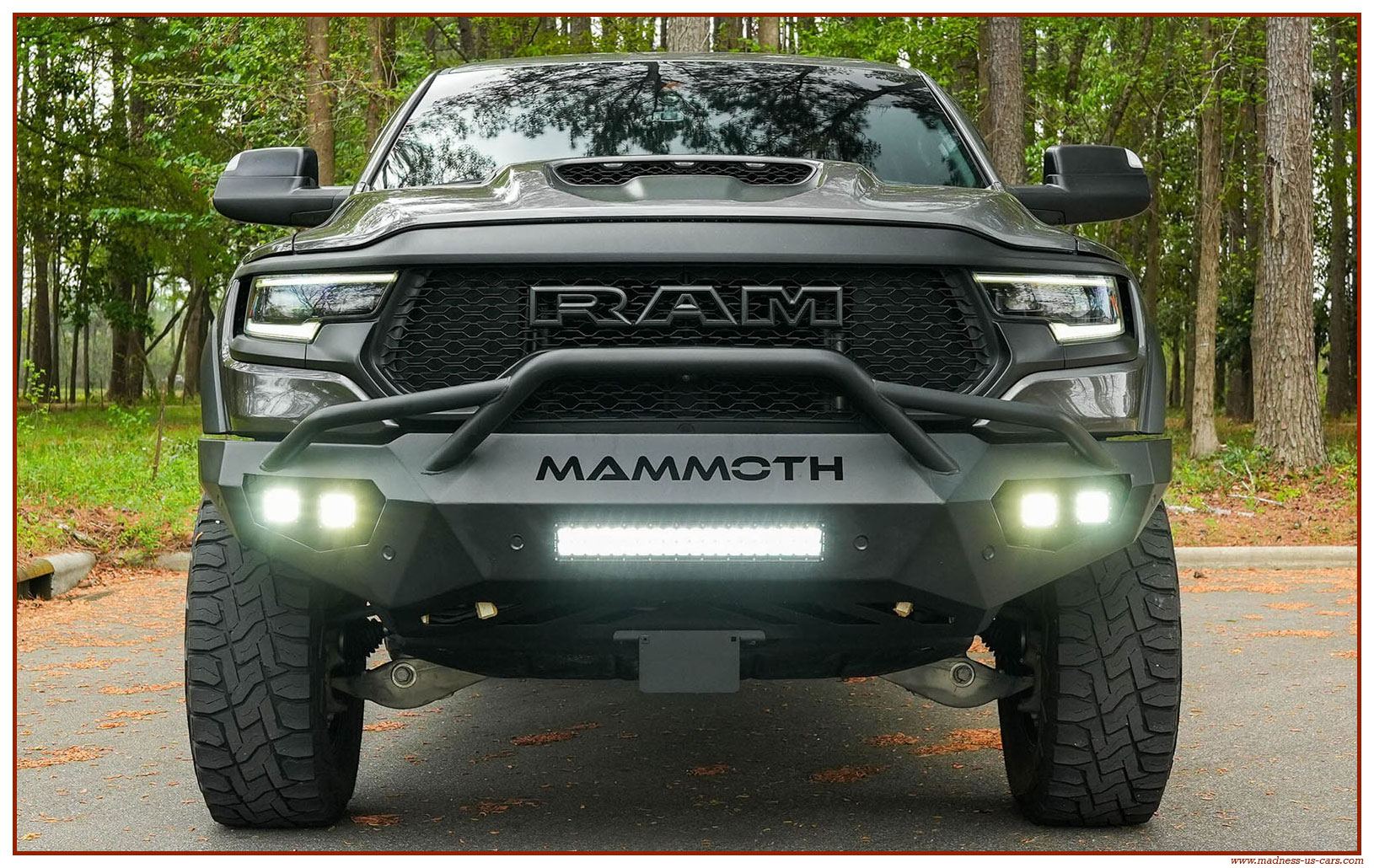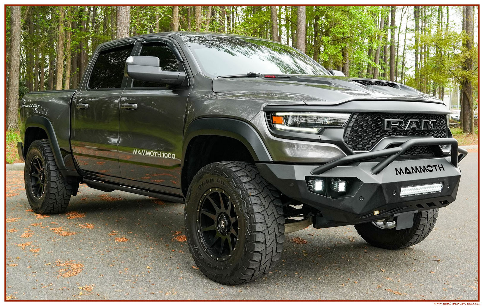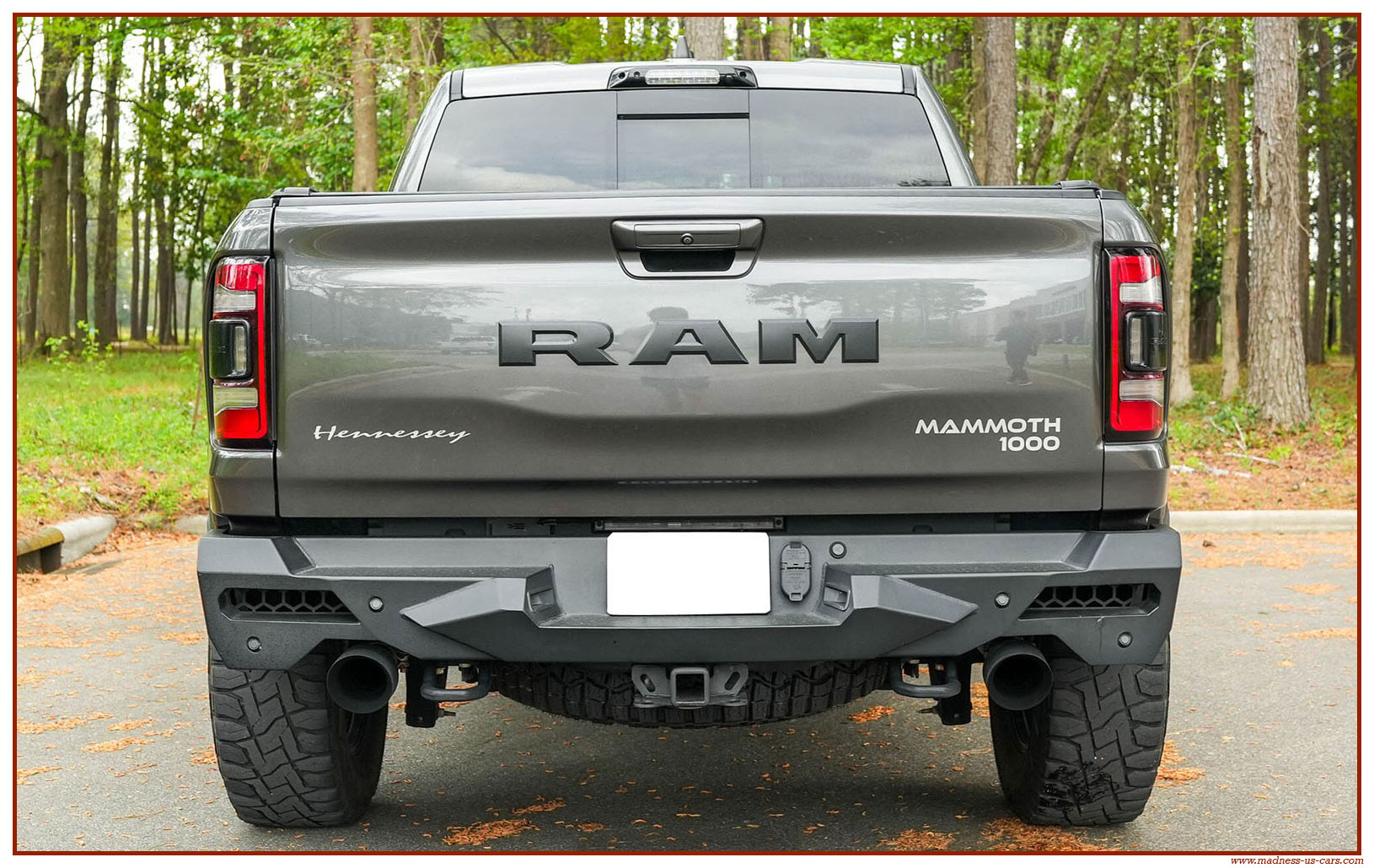 Madness US vous propose la version la plus exclusive du Ram 1500 TRX. Le Hennessey Mammoth 1000 est la version ultime du Ram TRX passée entre les mains du célèbre préparateur Texan, 200 exemplaires seulement produits ! Hennessey à complètement revu le V8 Supercharged de 6,2 litres de cylindrée : Il développe maintenant la puissance de 1012 chevaux pour un couple de 1312 Nm. C'est le pickup le plus puissant du marché, et aussi le plus performant : Le 0 à 100 km/h est abattu en 3,2 secondes seulement.