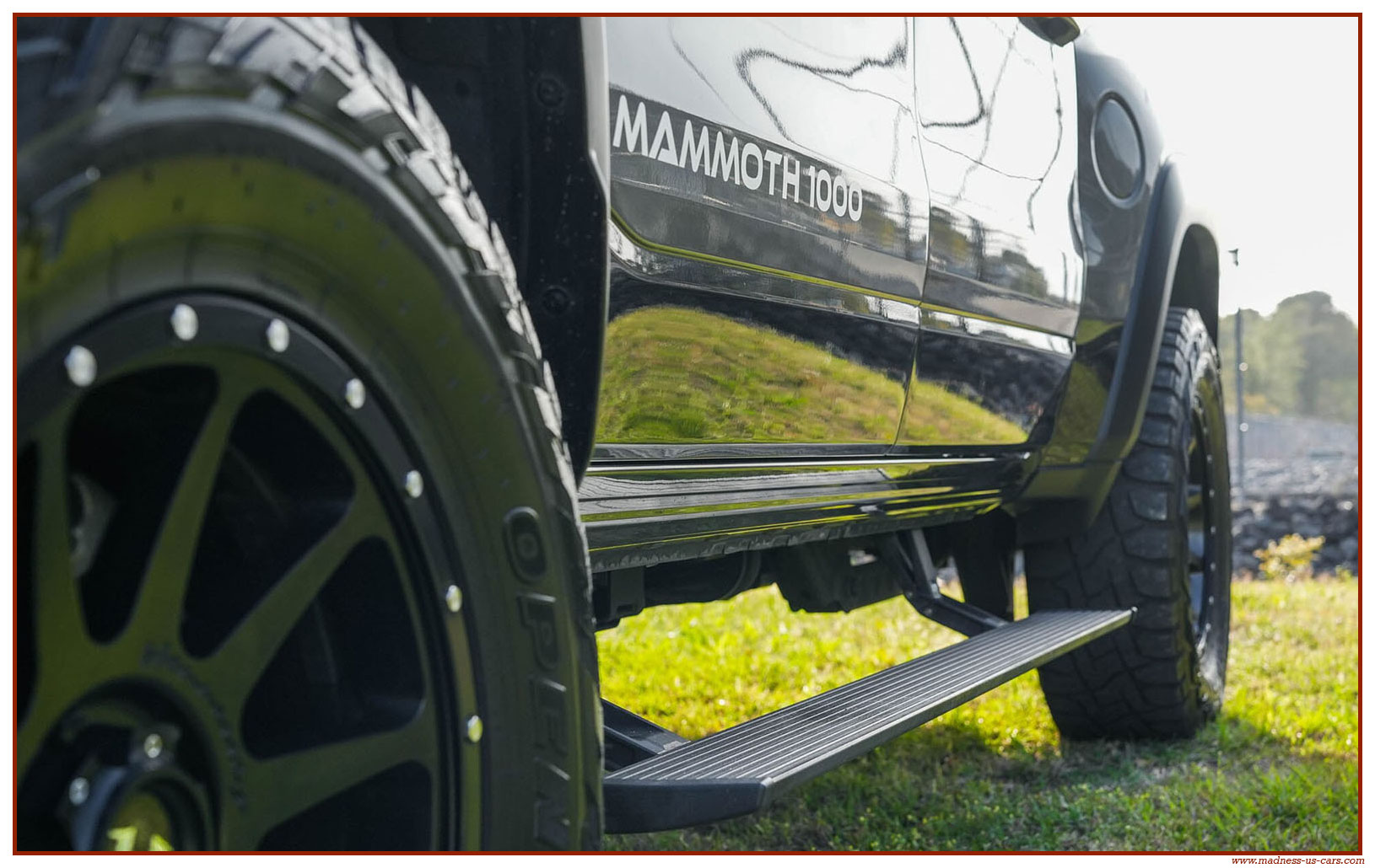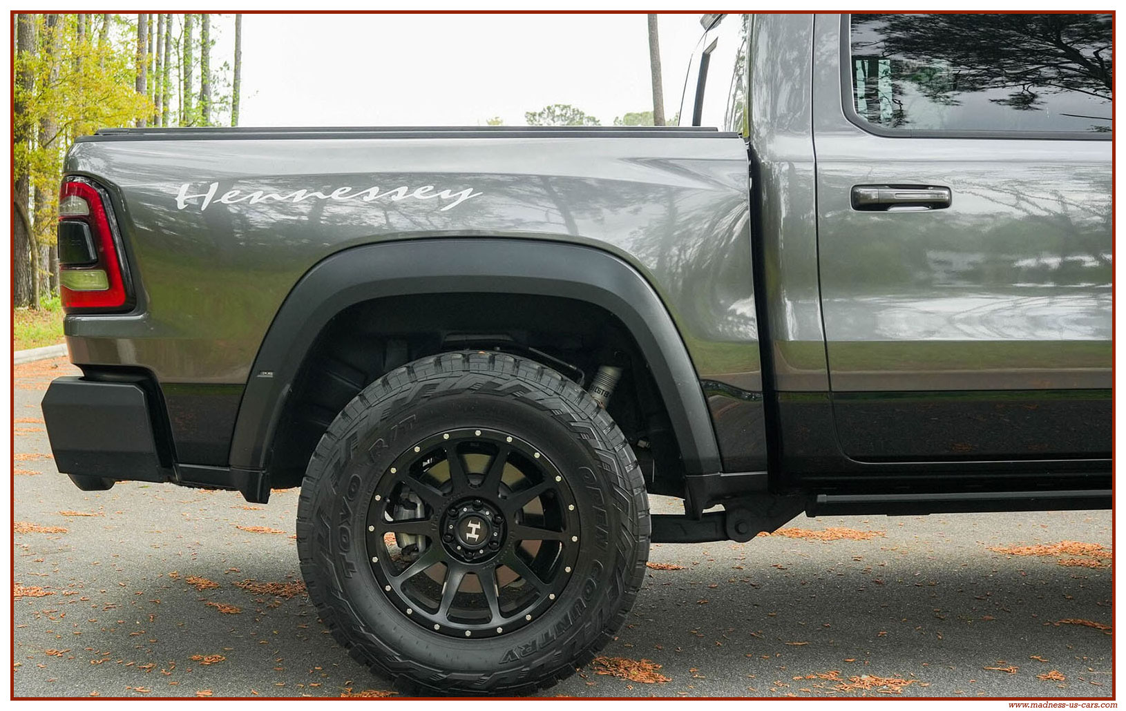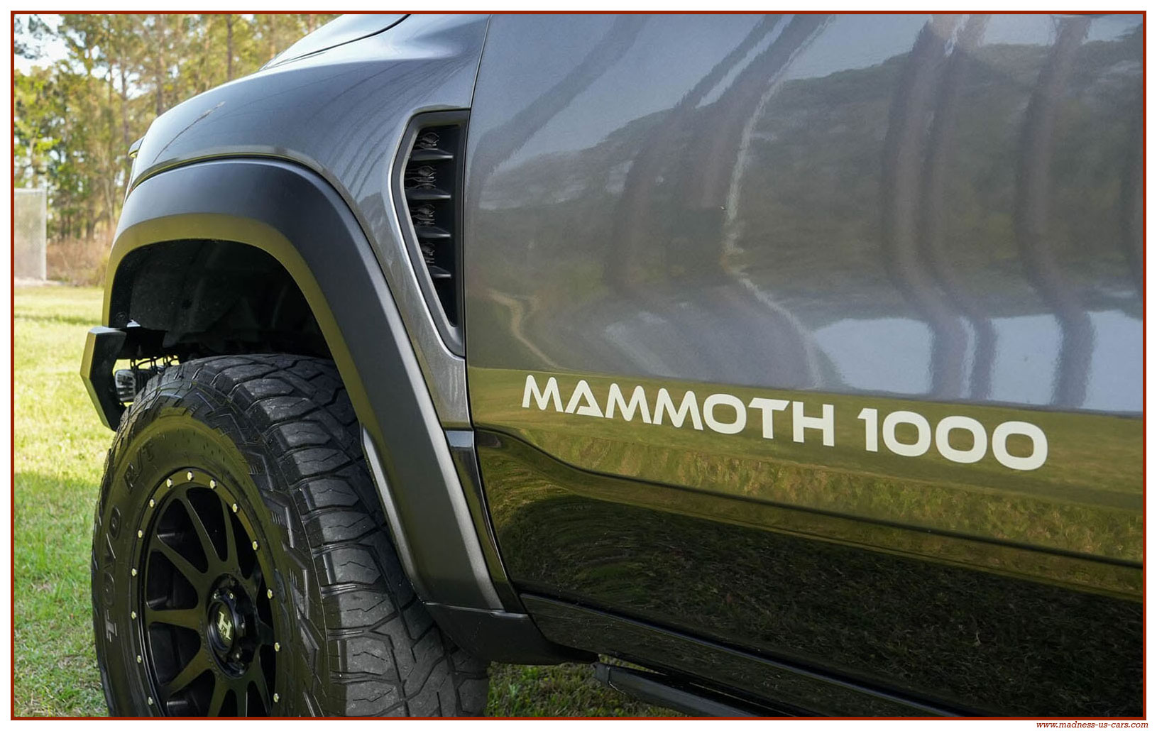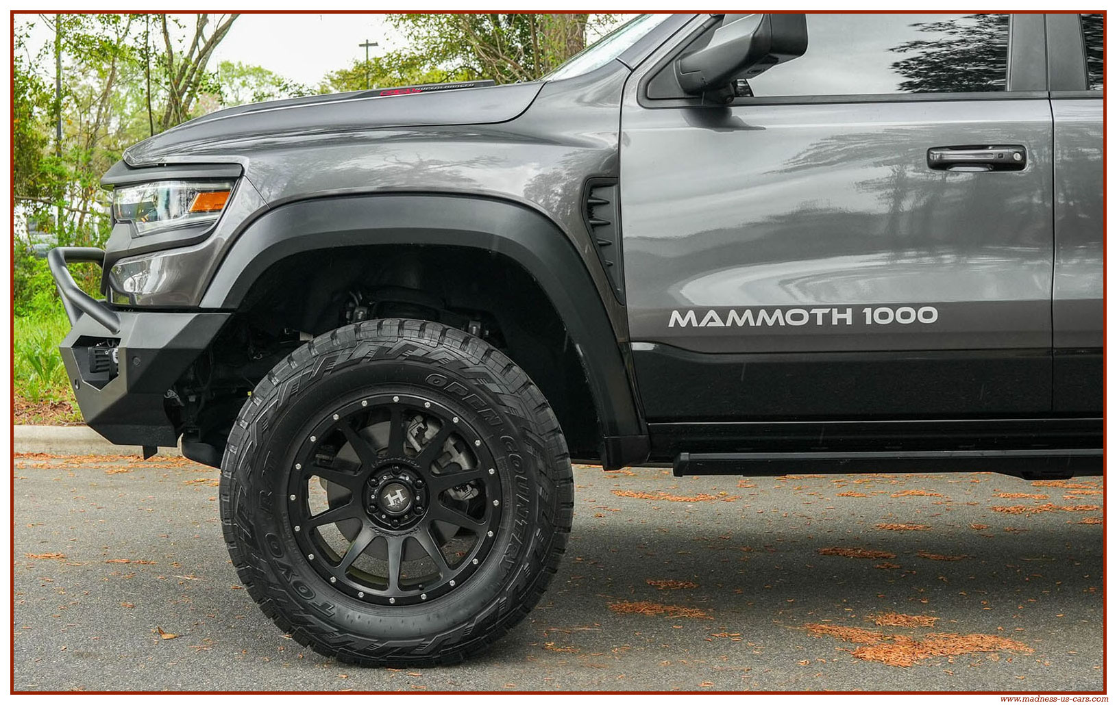 Madness US vous propose la version la plus exclusive du Ram 1500 TRX. Le Hennessey Mammoth 1000 est la version ultime du Ram TRX passée entre les mains du célèbre préparateur Texan, 200 exemplaires seulement produits ! Hennessey à complètement revu le V8 Supercharged de 6,2 litres de cylindrée : Il développe maintenant la puissance de 1012 chevaux pour un couple de 1312 Nm. C'est le pickup le plus puissant du marché, et aussi le plus performant : Le 0 à 100 km/h est abattu en 3,2 secondes seulement.