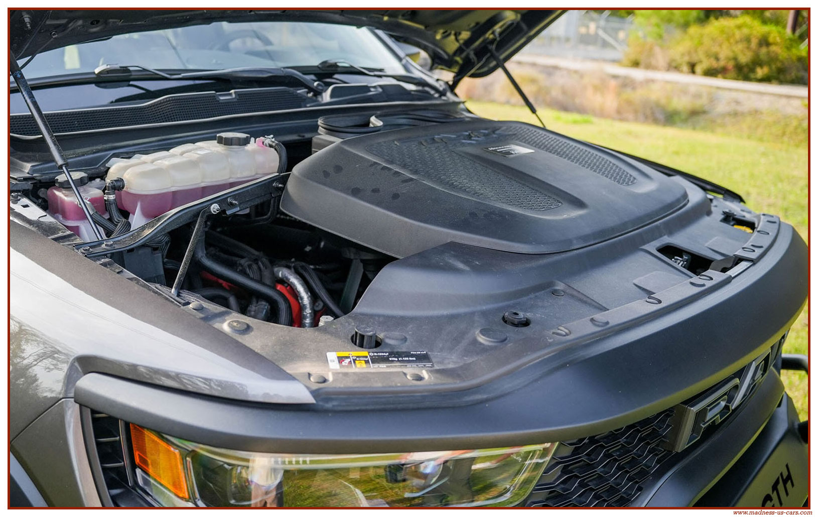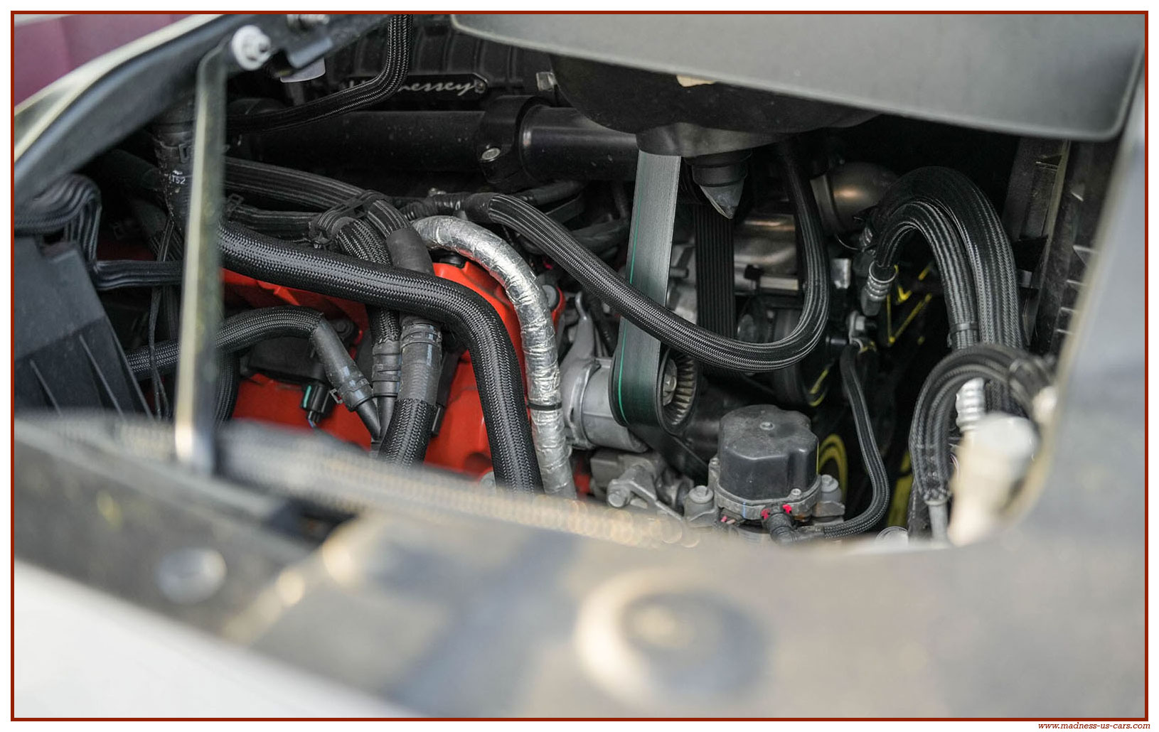 Pour obtenir des performance de cet ordre, le moteur V8 Hellcat à compresseur est entièrement revu et amélioré par Hennessey au Texas. Nouveau compresseur Hennessey de 2,65 litres de cylindrée, nouveau système d'admission, nouveaux injecteurs, calibration adaptée de la gestion électronique ...