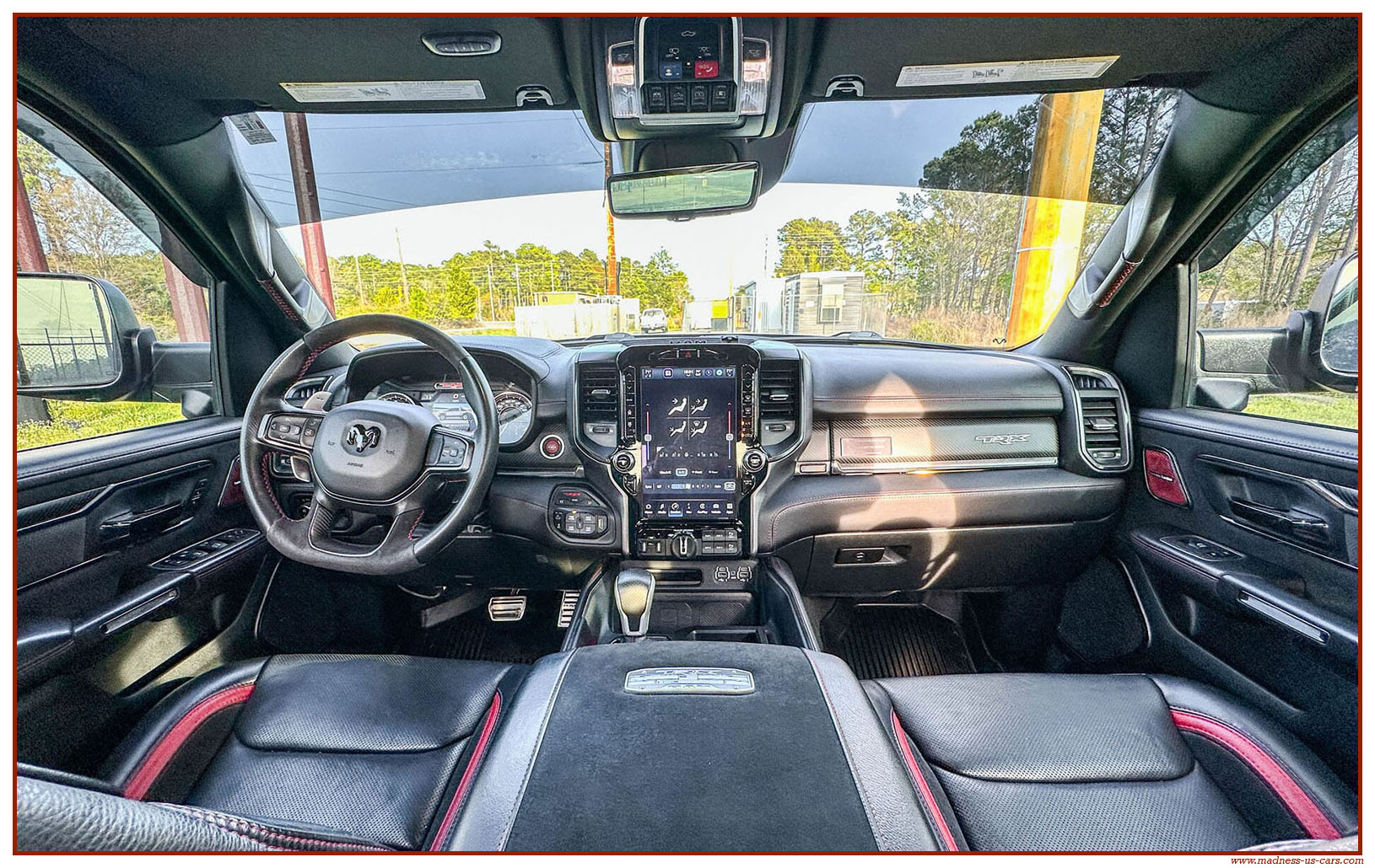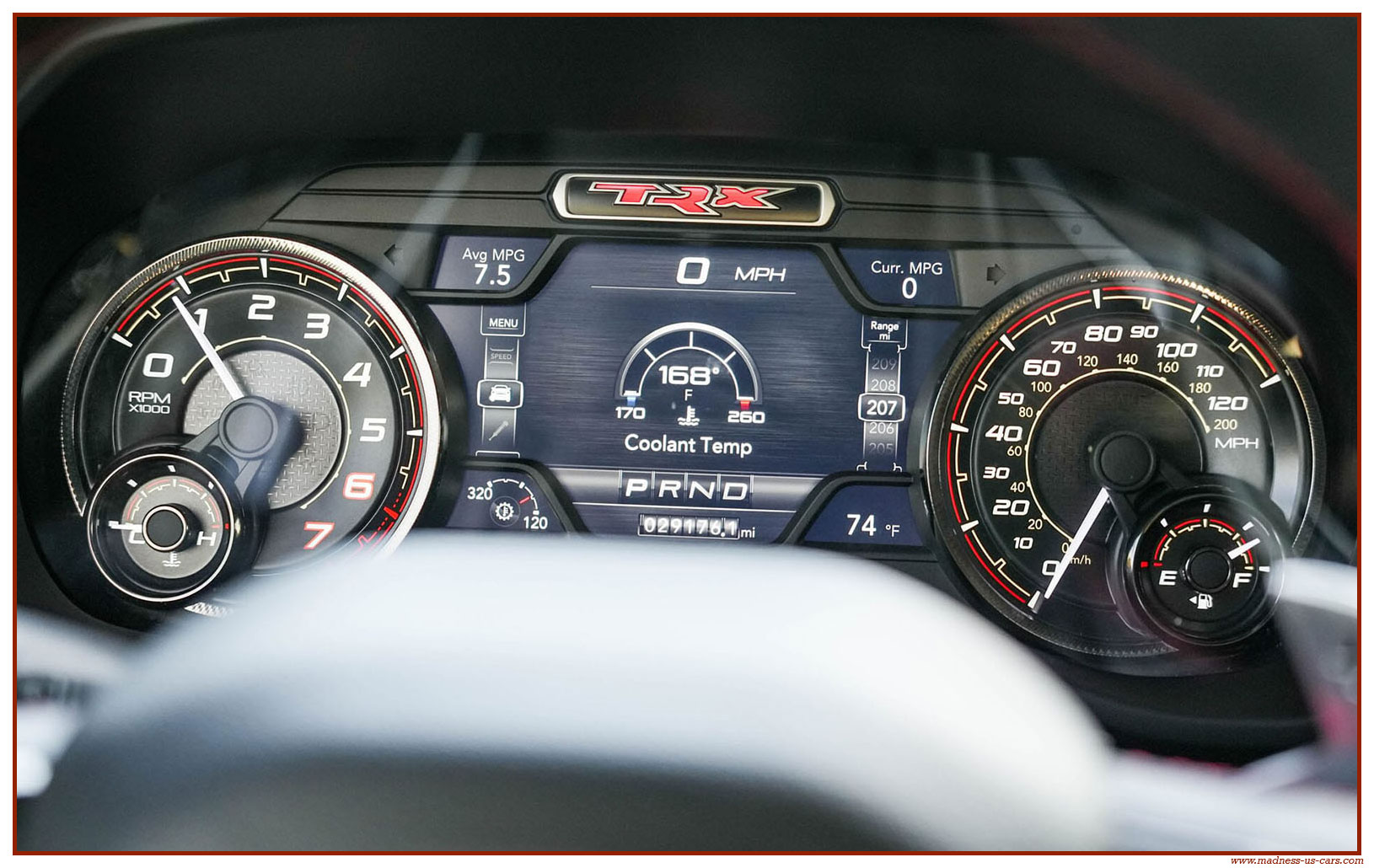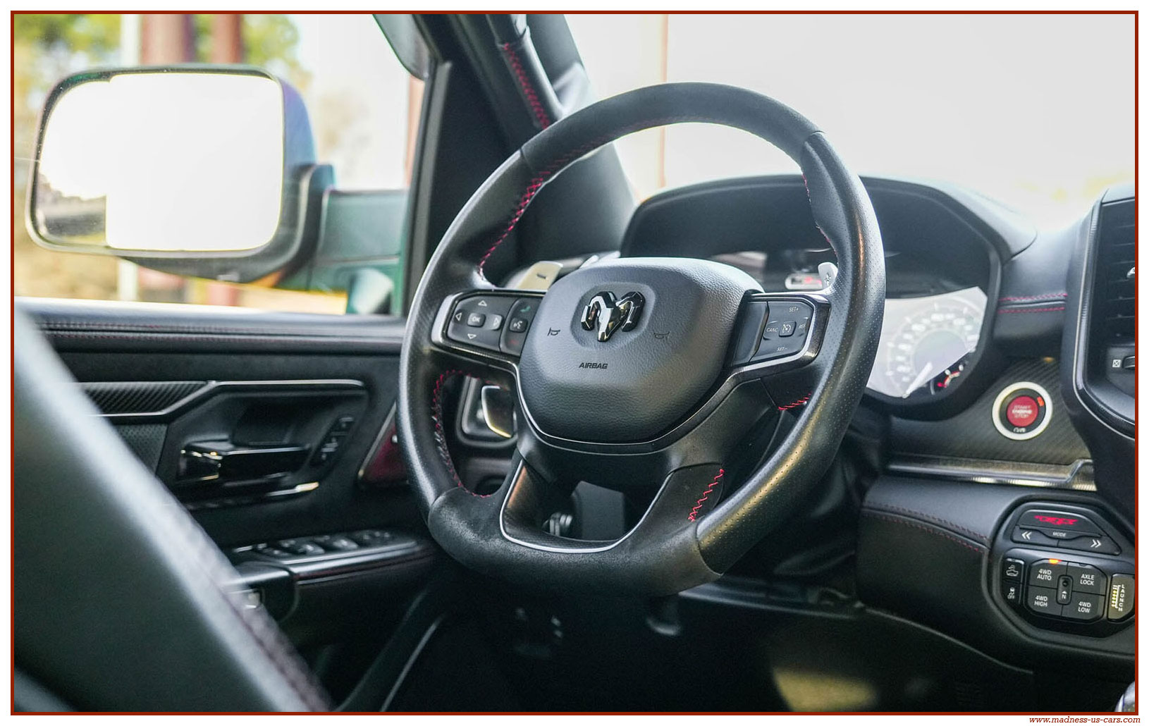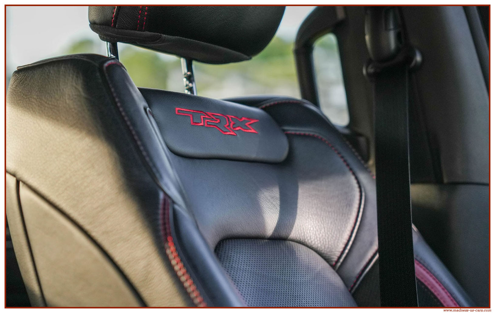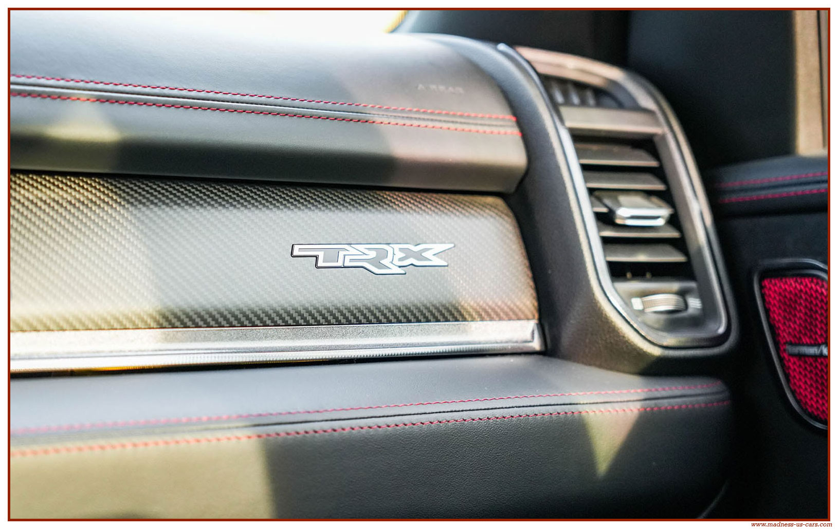4x4 - V8 Hemi Supercharged - 6,2 L - 1012 chevaux - 1312 Nm - Boîte automatique 8 rapports - Série limitée numérotée 136/200 - Cabine Crew Cab - Pare chocs avant et arrière Hennessey - Réservoir 124 litres - Sellerie cuir alcantara TRX Hennessey - Palettes au volant - Affichage tête haute - Launch Control - Ordinateur de bord - Performance Pages - Jantes Hennessey noires 20 pouces - Pneus Toyo Open Country 37 pouces - ABS - ESP - Amortisseurs Bilstein Black Hawk - Démarrage sans clé - Démarrage à distance - Fermeture centralisée - Quatre vitres électriques - Rétroviseur intérieur caméra - Rétroviseurs électriques et rabattables - Toit ouvrant panoramique à double panneau vitré - Climatisation automatique séparée - Airbags frontaux et latéraux - Pédalier réglable électriquement - Régulateur de vitesse adaptatif avec anticollision - Aide au maintien dans la voie - Feux à leds - Auditorium USB Harman Kardon 19 enceintes - Ecran tactile UConnect 12 pouces - Navigation GPS Europe - Equipement téléphone mains libres Bluetooth - Apple CarPlay - Android Auto - Applications Off Road - Chargeur smartphone par induction - Sièges électriques à mémoire - Sièges avant chauffants et climatisés - Volant chauffant - Sièges arrière chauffants et climatisés - Caméra 360° - Radars de stationnement avant et arrière - Capteurs angles morts - Détecteur de pluie - Lunette arrière ouvrante électriquement et dégivrante - Ouverture de benne assistée - Ouverture de benne à distance - Echappement double - Frein de stationnement électrique - Couvre benne - Bed liner pulvérisé - Marchepieds électriques - Attelage - Alarme - Antibrouillards.