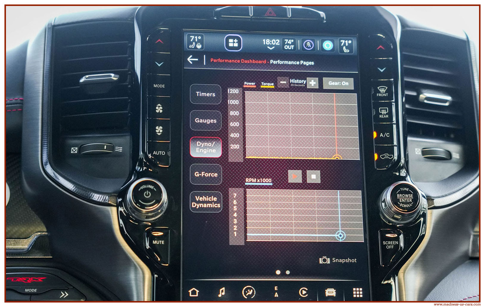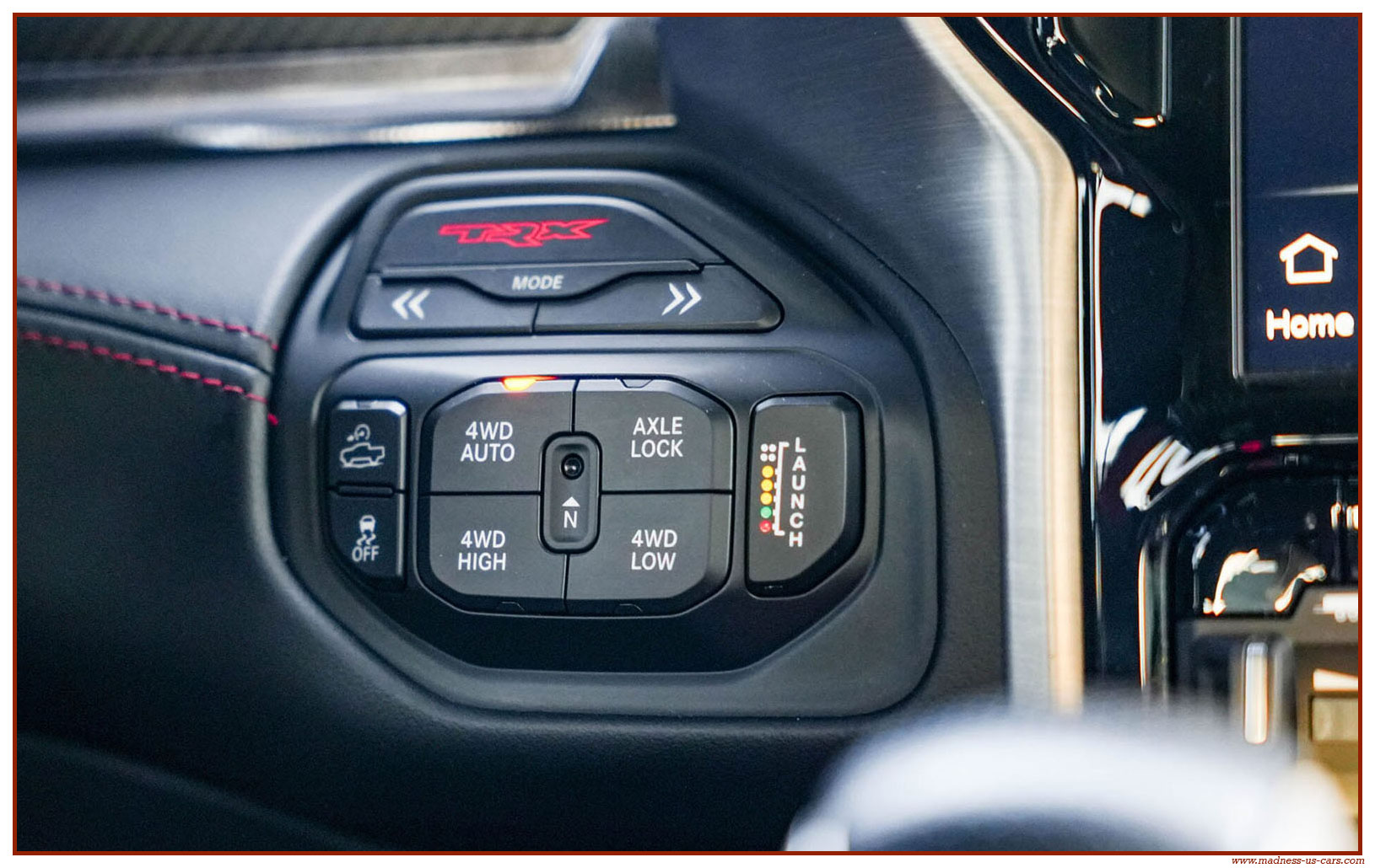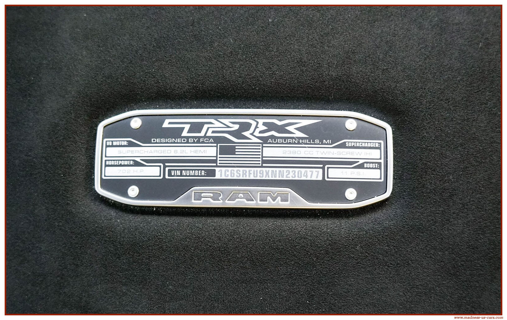 Le Ram TRX Hennessey propose un excellent niveau d'équipement : Sellerie cuir alcantara badgée Hennessey TRX, sièges électriques chauffants et climatisés, auditorium Harman Kardon 19 enceintes, écran 12 pouces, toit panoramique, GPS, Bluetooth, badges spécifiques Hennessy Mammoth avec numéro de série limitée et numérotée 136/200 ... Il propose aussi les dernières nouveautés du Ram TRX : Launch Control, applications Off Road et sélecteur de mode de conduite. Le Ram 1500 TRX Hennessey Mammoth 1000 vous est proposé par Madness US, homologué en France et garanti 12 mois.